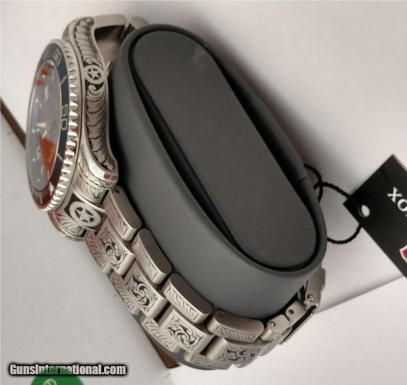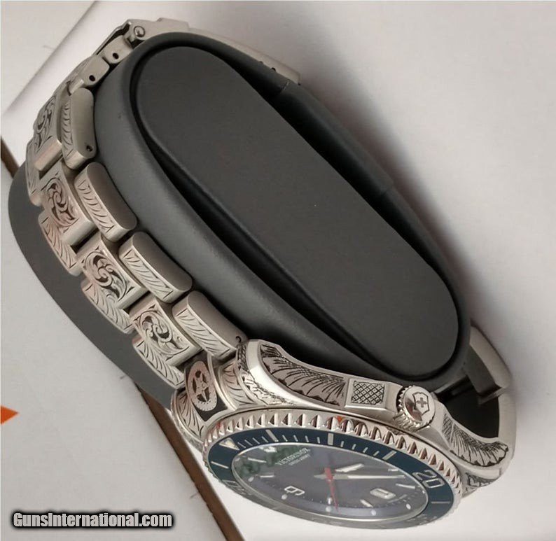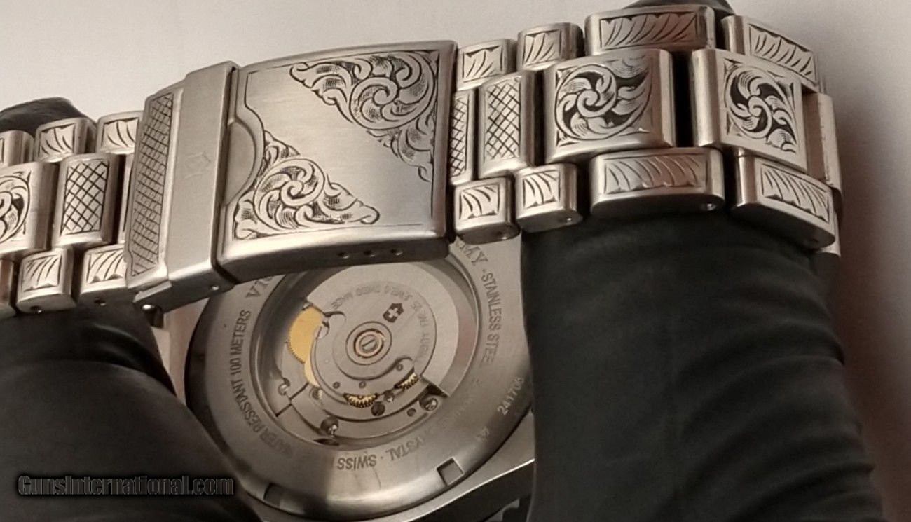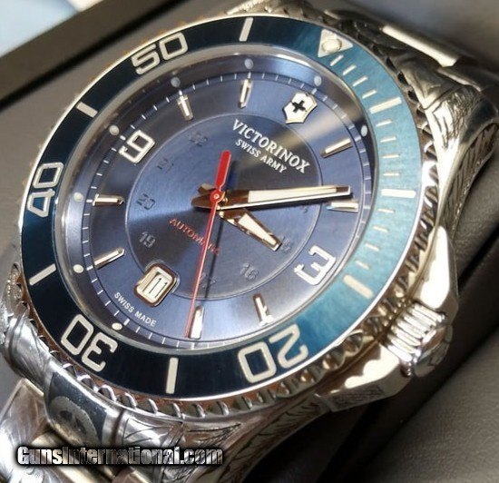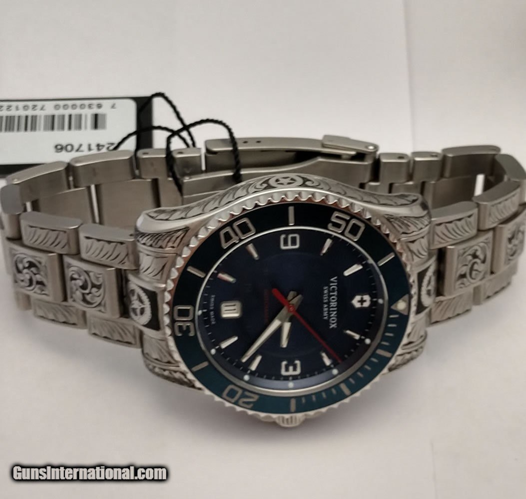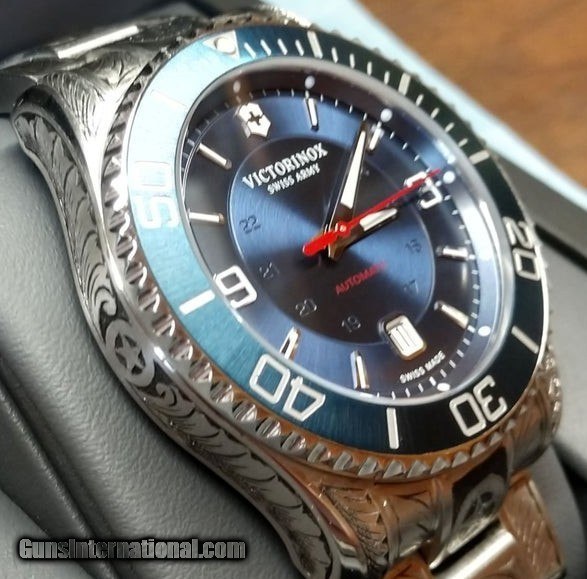 Description: This highly collectible one of a kind watch comes with the boxes and hang tags as well as a letter of authentication from the engraver. This Victorinox Swiss Army 43mm Maverick automatic selfwinding watch is new. It is Engraved by Master firearms engraver David Wade Harris in a Texas Ranger Southwestern theme. The watch is signed by him. Watches engraved at this level are very unique.” Victorinox Marverick 43mm model 241706 ETA 2824-2 Automatic Movement blue face/ blue bezel sapphire glass with AR coating inner layer hacking second, manual winding getting +/- 4 sec very accurate comes with original box, hang tag, Letter of Authenticity from the Engraver Also see thewatchengraver see the youtube video ://youtu.be/vI_rcHVG2Y0 SOLD |
