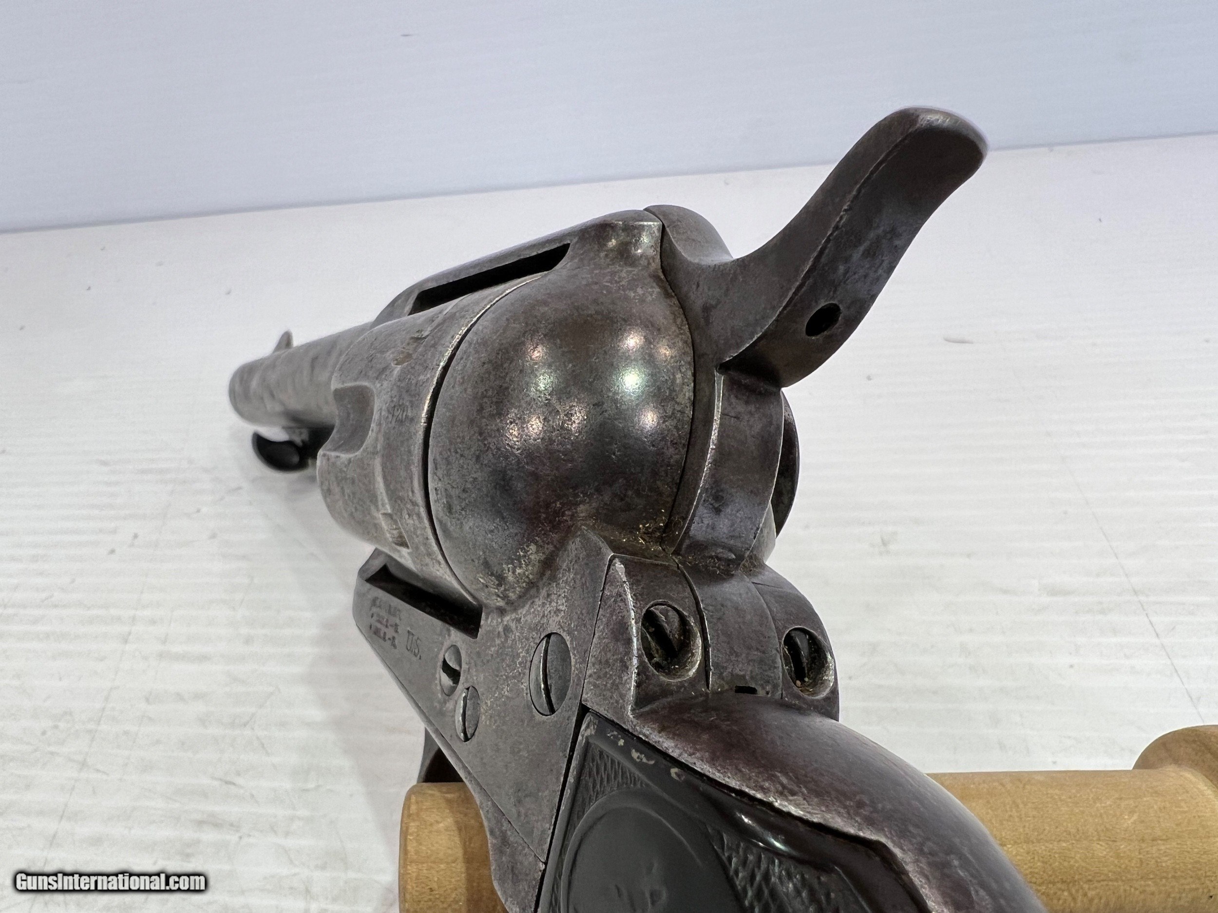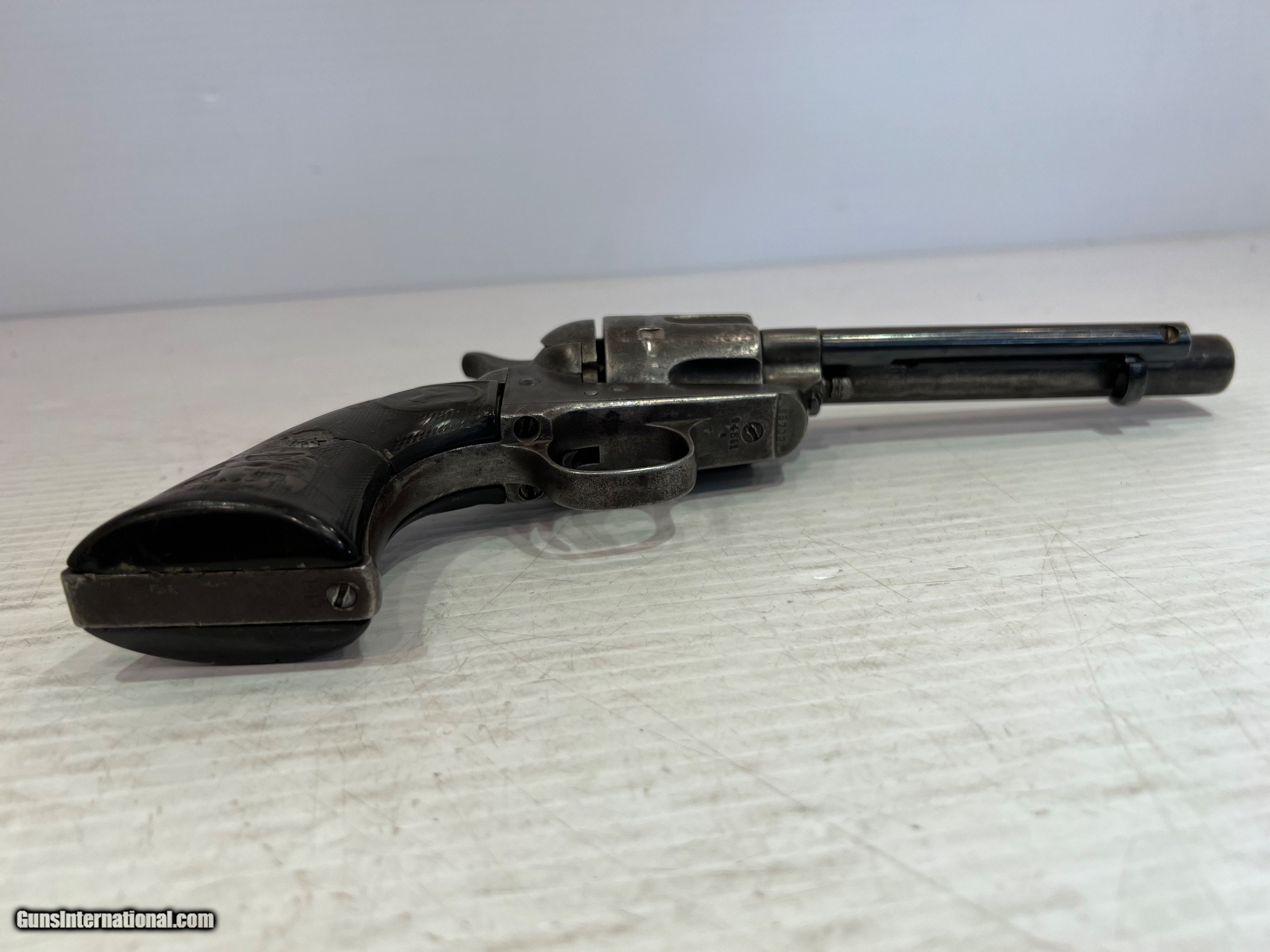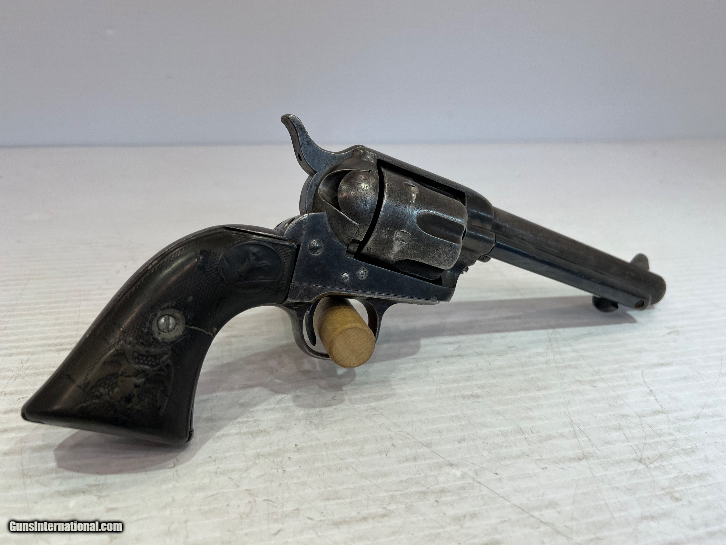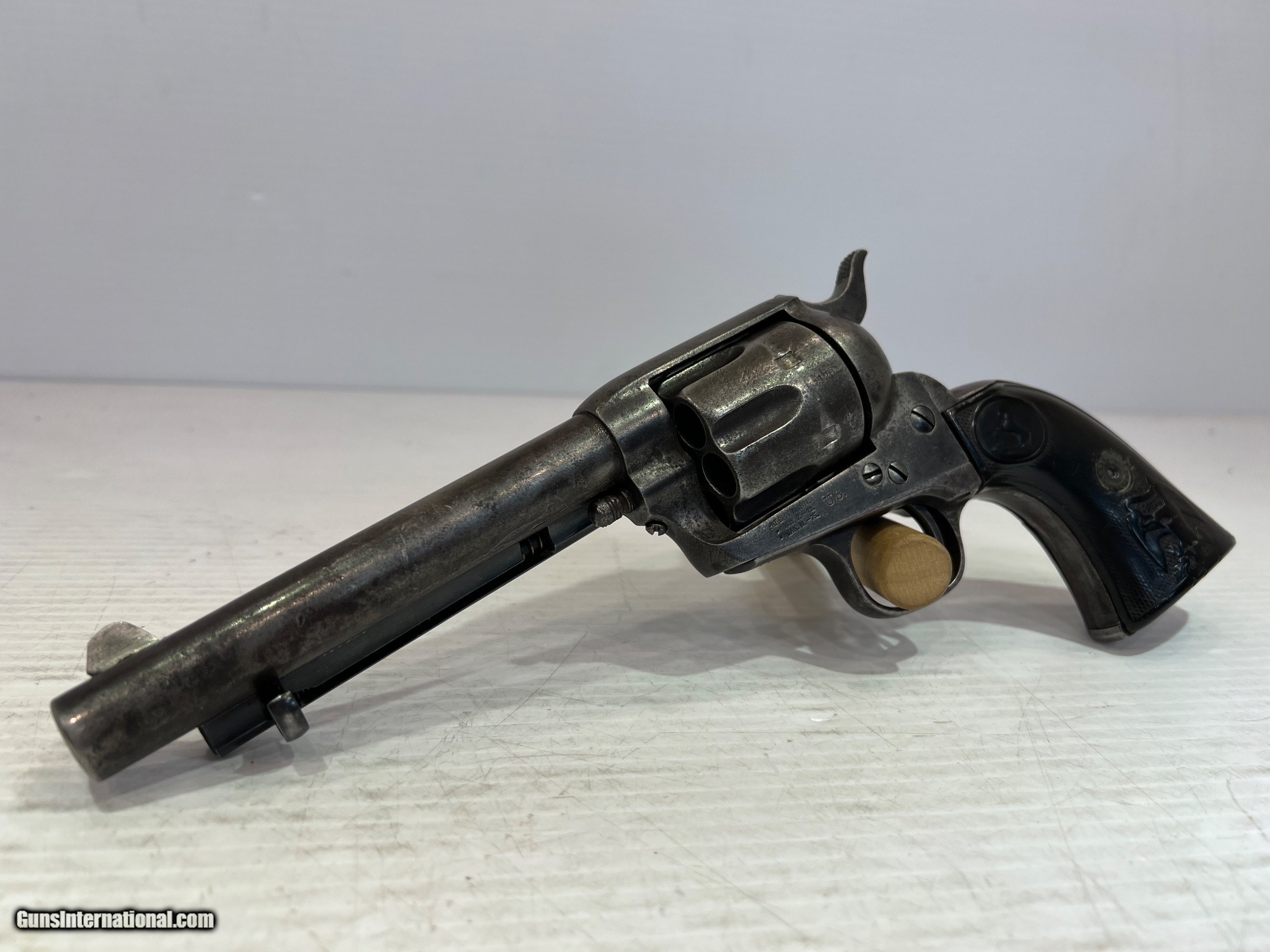 Description: Used Colt SAA (Single Action Army) .45 Colt, Single-Action Revolver, 5.5" Barrel Black Grips, Patinaed Finish, US Property, No Box WE DO NOT SHIP INTERNATIONALLY $40 Shipping. Pictures are of the item listed. Must be shipped to an FFL holder. The item is on display at our shop but will be taken off the shelf once the starting is met. Please feel free to contact us directly. Three day inspection from date items arrives at your FFL. Payment may be personal or cashiers check, money order or credit card "3% surcharge for credit card". QUESTIONS? CALL/TEXT STEVE AT 580.327.7372 SOLD Handgun Caliber: .45 Colt Serial Number: 95709 |