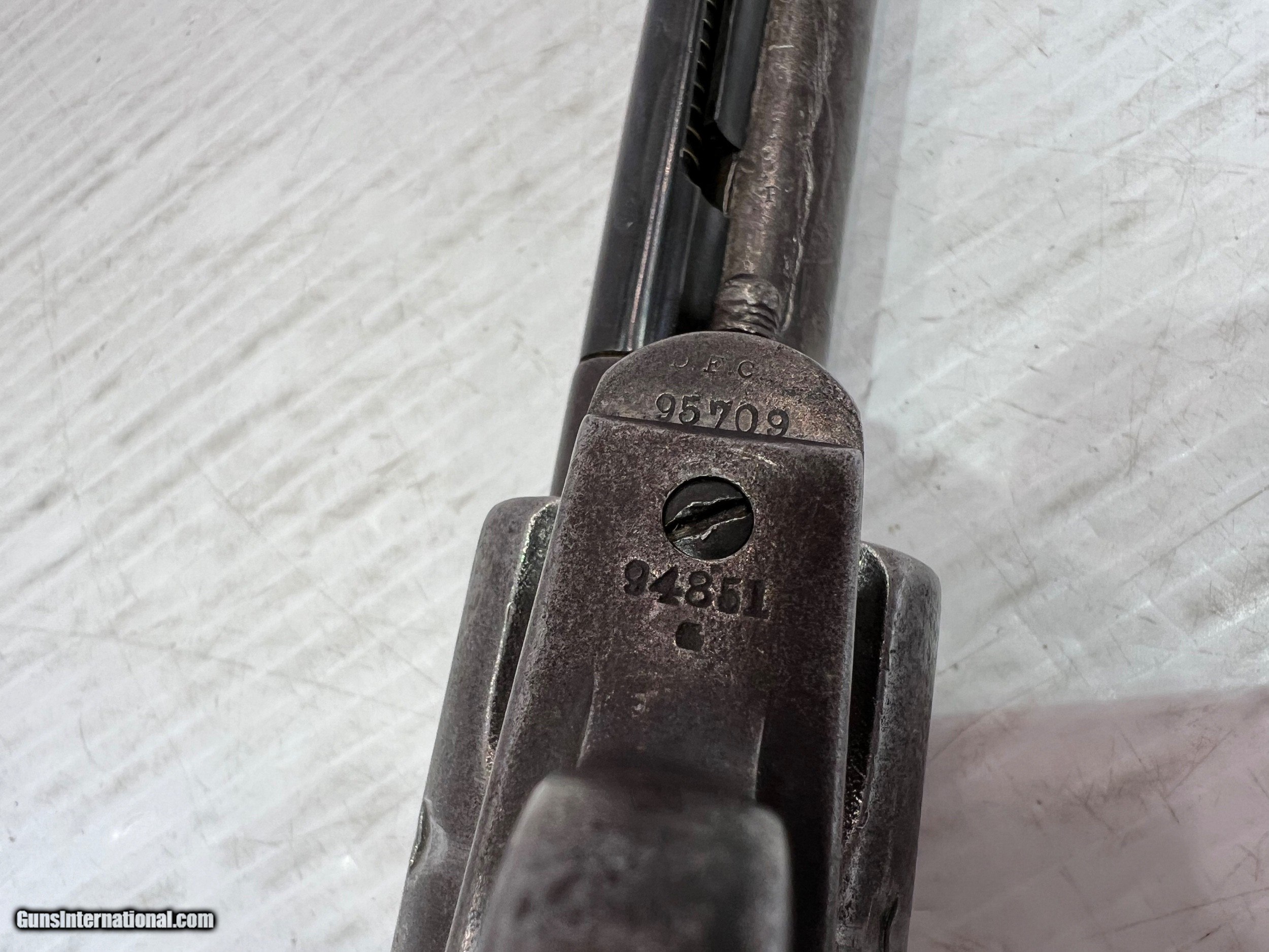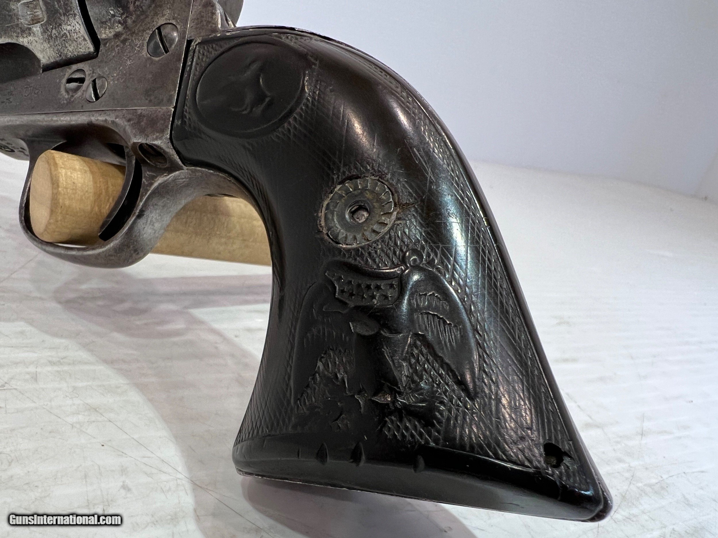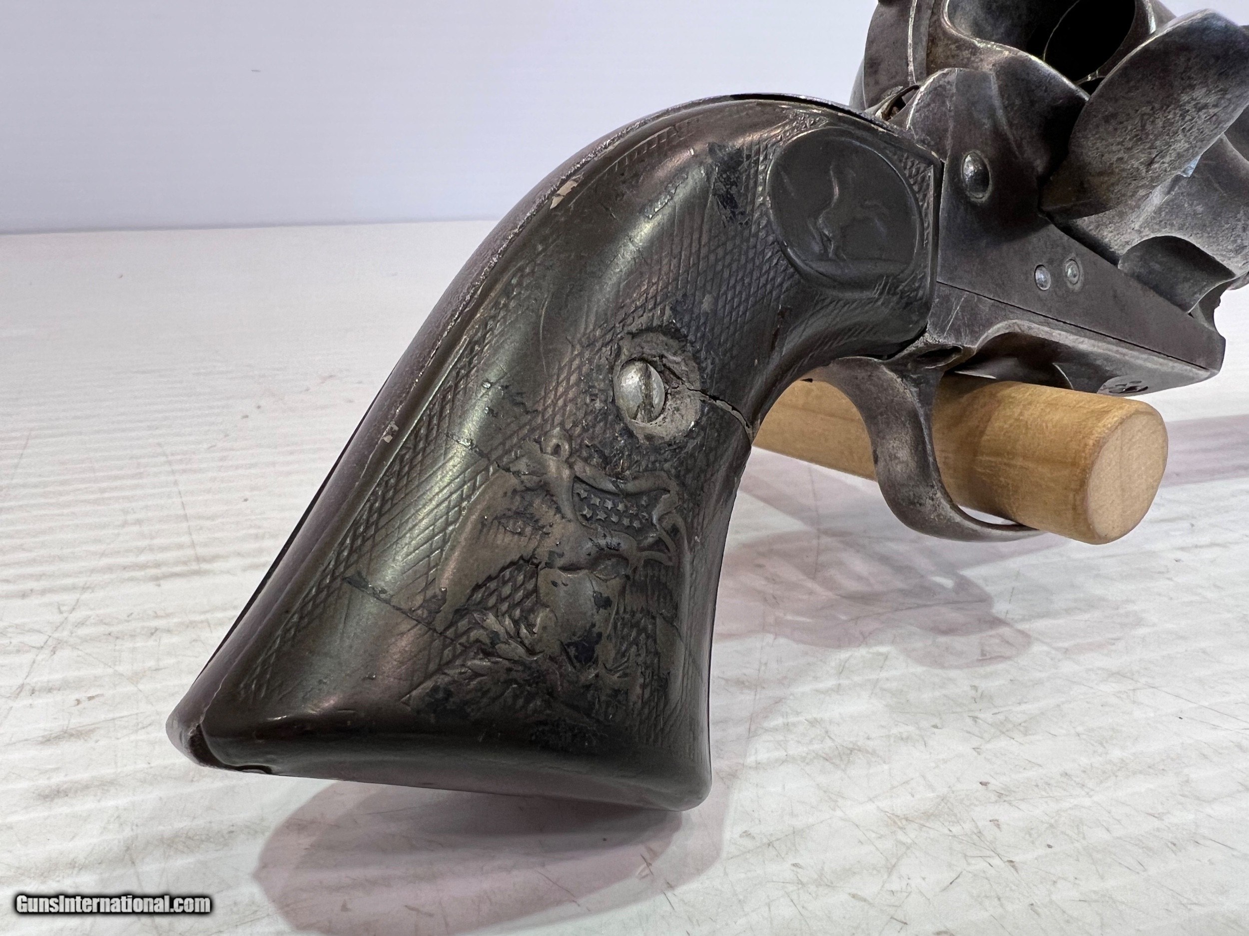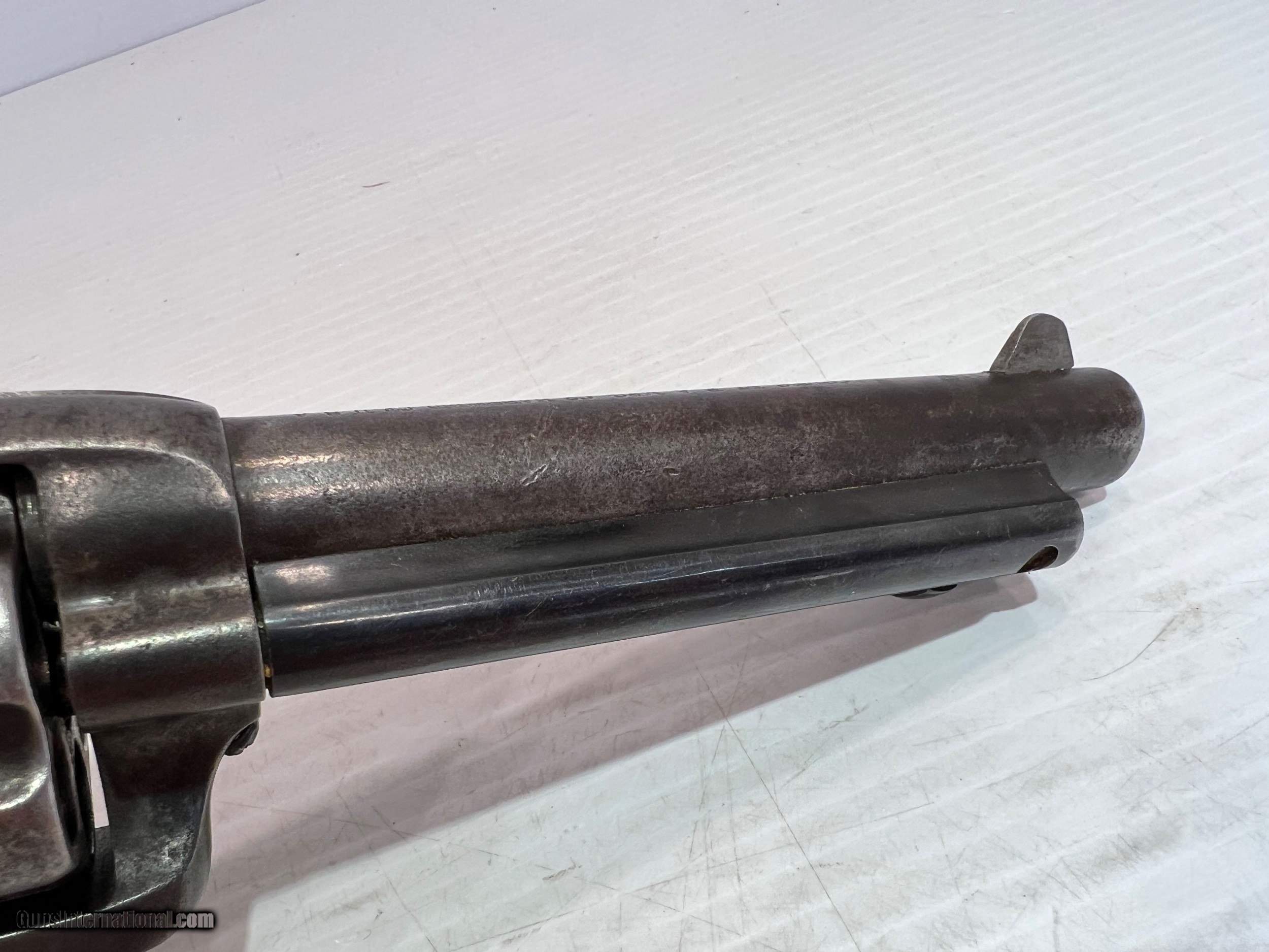 Description: Used Colt SAA (Single Action Army) .45 Colt, Single-Action Revolver, 5.5" Barrel Black Grips, Patinaed Finish, US Property, No Box WE DO NOT SHIP INTERNATIONALLY $40 Shipping. Pictures are of the item listed. Must be shipped to an FFL holder. The item is on display at our shop but will be taken off the shelf once the starting is met. Please feel free to contact us directly. Three day inspection from date items arrives at your FFL. Payment may be personal or cashiers check, money order or credit card "3% surcharge for credit card". QUESTIONS? CALL/TEXT STEVE AT 580.327.7372 SOLD Handgun Caliber: .45 Colt Serial Number: 95709 |