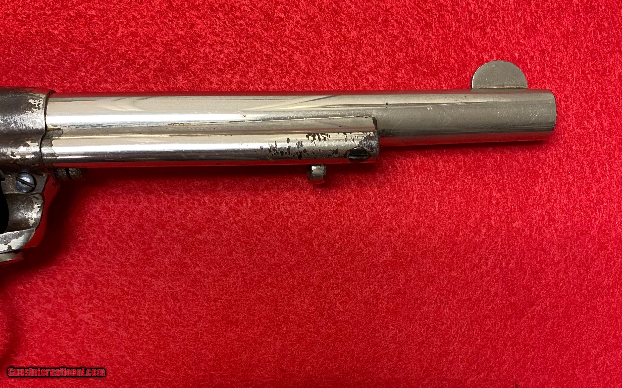 Description: Antique Colt Thunderer .41 DA revolver with a 6" barrel and nickel finish from Colt. Manufactured in 1888. This gun functions fine with tight lock up. All matching serial numbers. Two line Hartford address on barrel. Very good condition overall. Original finish around 75%. Appears to have the original Colt grips and are in excellent condition. Great old collectible Colt. $35.00 insured shipping to your home. SOLD Antique: Yes Handgun Caliber: .41 Long Colt (.41 Colt, .41 LC) Manufacturer: Colt Model: Thunderer Serial Number: 71217 Barrel Length: 6” Chambers: Six Condition: Very good Metal Condition: Very good Bore Condition: Very good Action: DA/SA Finish: Nickel Sights: Fixed Manufacture Date: 1888 Item Location: WV |
