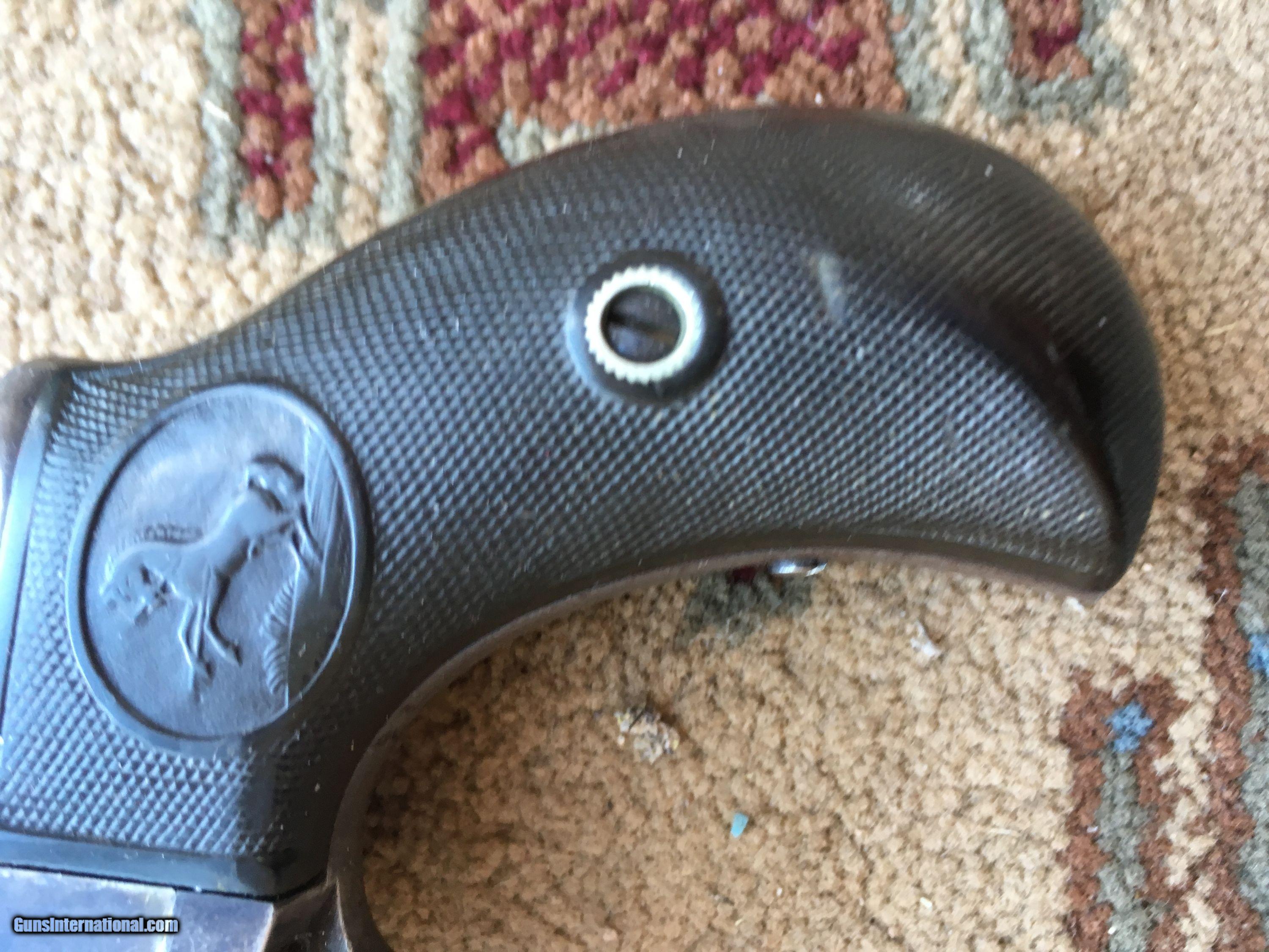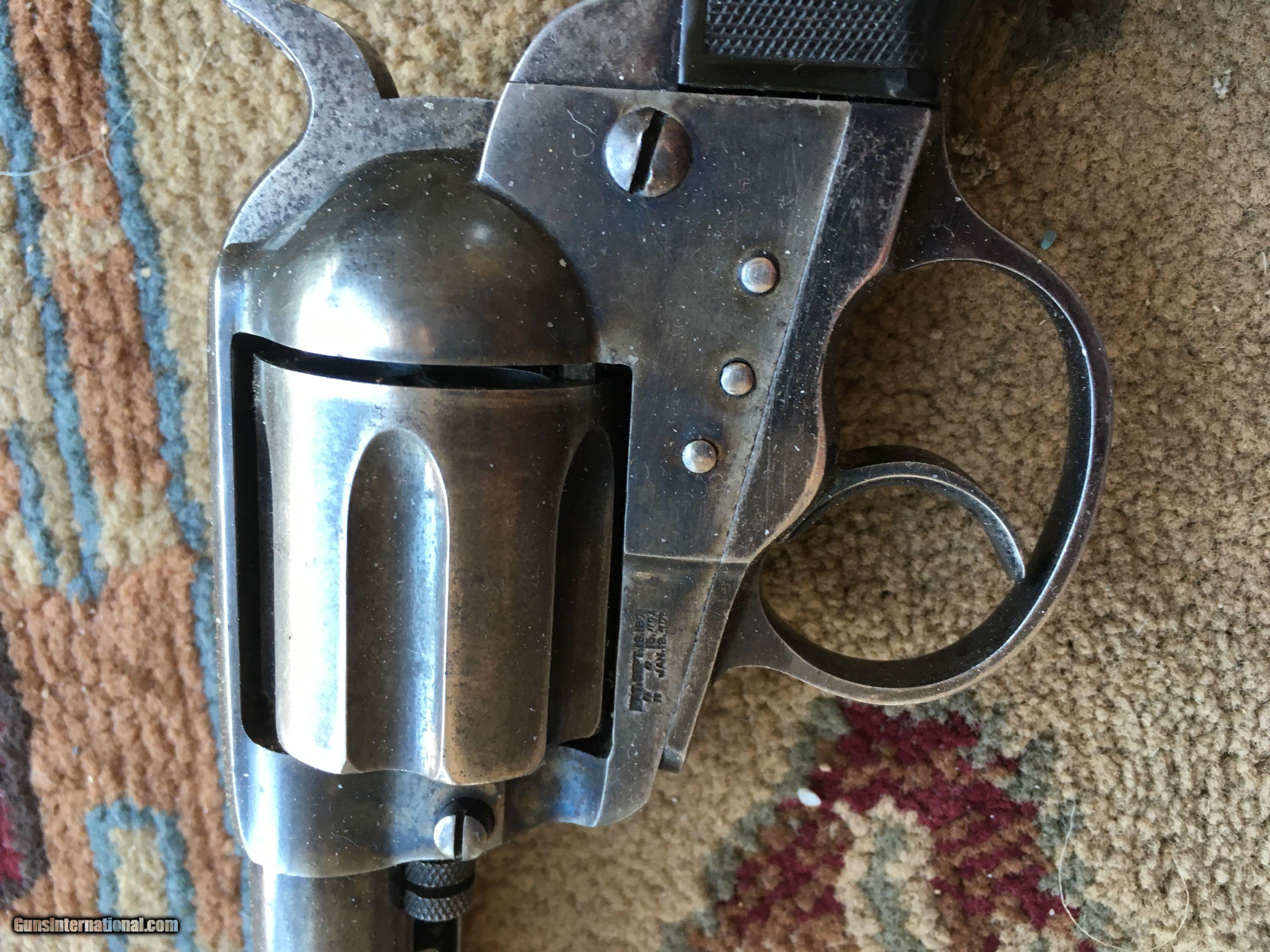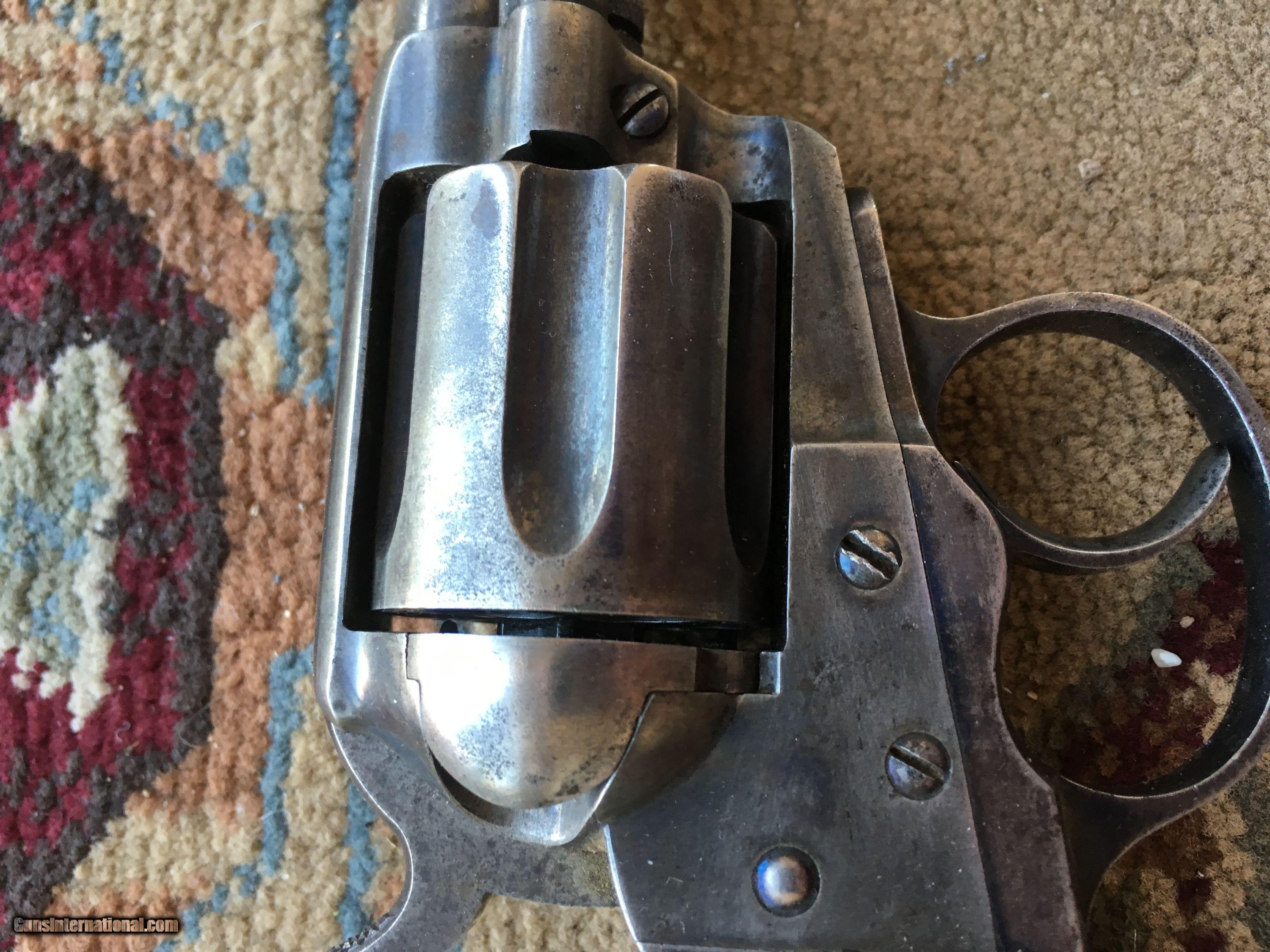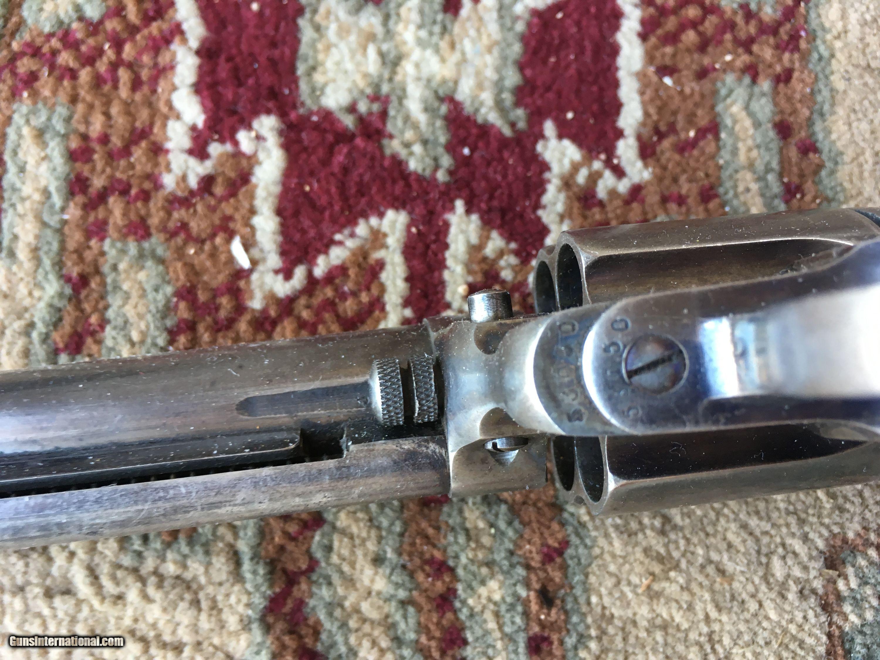Description: An excellent Colt Thunderer Revolver, 4"x .41 cal., SN 53xxx all matching. Bore ix terrific with sharp rifling. Gun retains a good >90% blue and case colors. Action is tight in both SA/DA. Grips are hard rubber and fix perfectly. Terrific gubn.Rosewood grips. REDUCED!!! SOLD Antique: Yes |