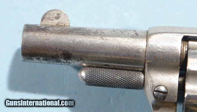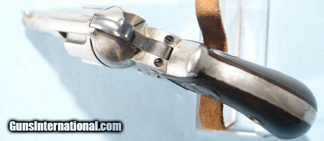 Description: EXCELLENT EARLY COLT MODEL 1877 D.A. THUNDERER .41 CAL. 2 ½” REVOLVER CA. 1884. Acid etched “COLT D.A. 41” panel on barrel and smallest size two line Hartford address. All matching (49xxx range) and original including all the screws and the grips. Excellent plus with 95% nickel and much of the blue on the screws, hammer and trigger. Gutta-percha grips in fine condition with no cracks or repairs. Excellent bore and chambers. Perfect working order. SOLD Antique: Yes |