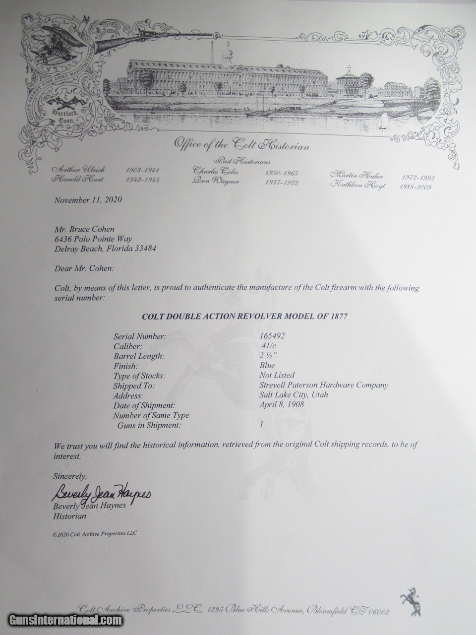 Description: Colt Model 1877 “Thunderer” Model Revolver; Serial No. 165492; Per Included Factory Letter: .41 Caliber with Blue Finish and 2 ½” Barrel; Shipped to Strevell Paterson Hardware Company of Salt Lake City, Utah on April 8, 1908 as a One Gun Shipment; Antique by Caliber and Design; Lots of Original Factory Metal Finish Remains; Nice Colt Hard Rubber Grips; Very Scarce 2 ½” Barrel; Perfect Action and Bore; Great 117 Year-Old Colt “Thunderer” Revolver; See All Photos for Condition; No Texts; Call (254)541-5765 or Email Only; PERSONAL PROPERTY of Harold Wieser; NOTICE: We Do Not Do Any Consignments - All Items Listed are Owned by Us - NO SALES to New Jersey or New York City - Antiques Only to Massachusetts and California; NOTE: All Modern Firearms Must Go to FFL Dealer who will Accept From Individual with Texas Driver License; Price: $2,900 Shipped; Payment Address: Harold Wieser - 1466 U.S. Hwy 77 - Rosebud, TX 76570; SEND PAYMENTS VIA USPS PRIORITY MAIL; BEWARE of SCAMS!!! - DO NOT SEND MONEY or CORRESPONDENTS ELECTRONICALLY UNLESS YOU HAVE SPOKEN to HAROLD WIESER FIRST! (254)541-5765 SOLD Manufacturer: Colt Model: 1877 Thunderer Serial Number: 165492 |