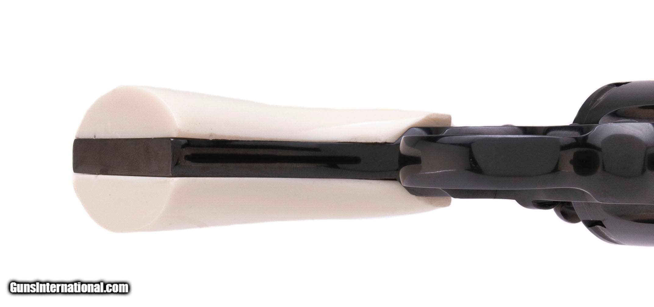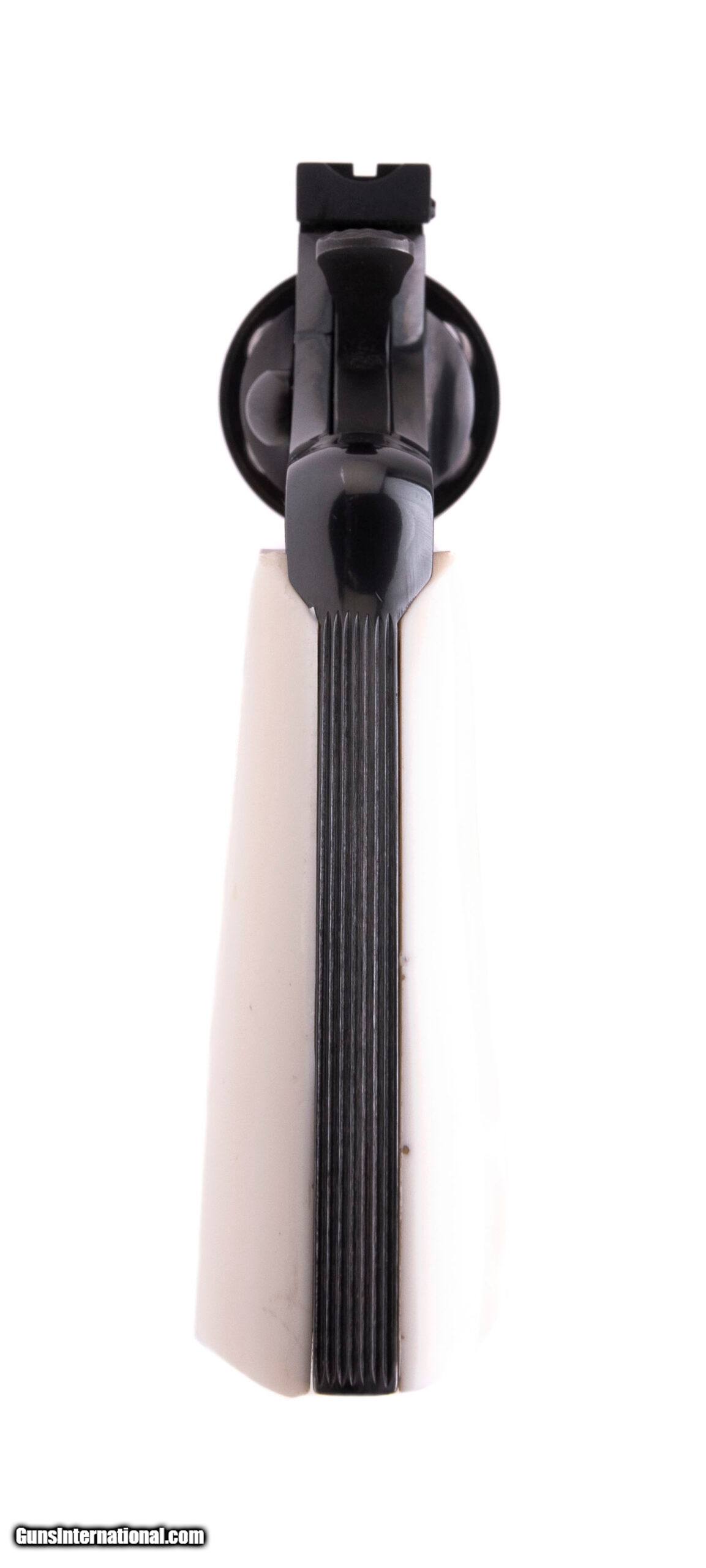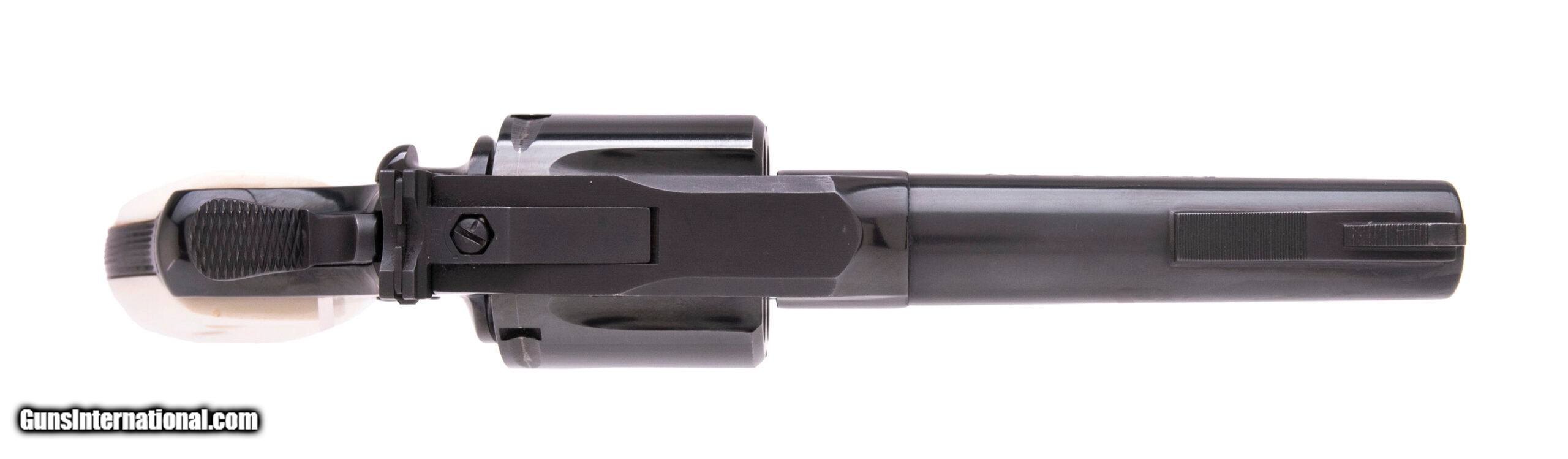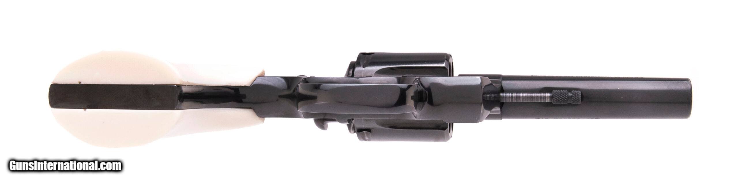 Description: "SN: 75627. Double-action revolver made by Colt in 1968. 4"" barrel with 6-round .357 magnum cylinder. Very good condition with some wear on the barrel blue. Frame and cylinder are excellent. Faux-ivory Colt grips are also excellent but not original. Bore is bright with strong rifling. Target model with wide hammer spur and adjustable rear sight. Action functions correctly with solid cylinder lockup. SOLD |