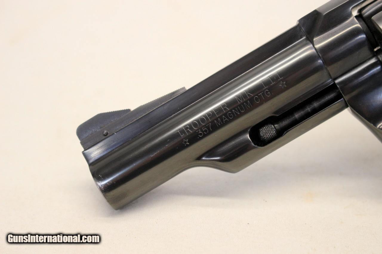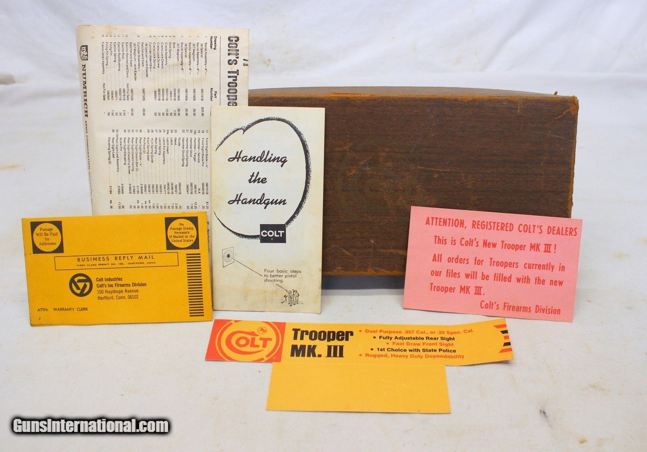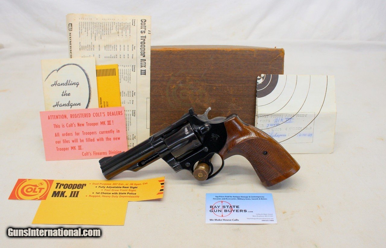 Description: We are offering for a sale a COLT Trooper MKIII double action revolver chambered in .357 Magnum caliber. This is a HIGH CONDITION model that comes with Original Box, Target and other paperwork. VERY COLLECTIBLE SECOND YEAR PRODUCTION!! 4" barrel is very good with attractive blued finish. There is some light muzzle wear on left side; Some light traces of red coloring on front blade sight. Crisp markings throughout. The frame is excellent showing very little wear. Cylinder is excellent showing very light line; Crisp bluing. Gun functions flawlessly in Single and Double Action. Original grip is very good to excellent with very light handling wear. Original 63 year old box shows some storage wear; Contents very good. HIGHLY COLLECTIBLE EXAMPLE! SHIPPING IS $29.95 USPS PRIORITY WITH INSURANCE **** PLEASE NOTE: WE ONLY ACCEPT MASTERCARD AND VISA AS PAYMENT OPTIONS (please note we charge a non-negotiable 3% CC fee) **** **** WE TAKE CREDIT CARD PAYMENT OVER THE PHONE. WE DO NOT TAKE PAYMENT THROUGH THIS **** PLEASE LOOK AT ALL PHOTOGRAPHS FOR CONDITION Please know the legality of any weapon in your state before . If a gun can’t be transferred to you we will charge a 15% re-stocking fee. We are in the shop MODAY, WEDNESDAY, THURSDAY, FRIDAY and SATURDAY 8am-4pm EST. We will be in touch within 24 hours of your purchase. Please be ready to provide CC information. Please have your FFL email a copy of their license to: . No Face To Face Transfers! Please note: Clicking "buy" does not guarantee that this gun is yours, However clicking “Buy” will reserve this gun for you, if it hasn’t been sold in store. We will try to do our best to remove the posts as efficiently as possible, but sometimes delays may ensue. “Buy” is your safest bet to reserve a gun. Also please add 6.25% MA state sales tax (if from MA) and 3% credit card shop courtesy fee for all out of state buyers SOLD |