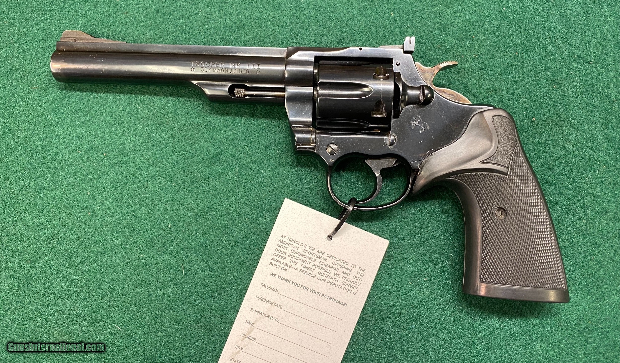 Description: Older Colts keep trickling in on consignment or traded in. This is the latest one, a Colt Trooper III. This one is blue with a 6 inch barrel, very good to excellent condition. We reserve the right to sell this item at our retail location until an offer is placed on Guns International. We accept major credit cards with a 4% surcharge. Personal checks are also welcome, however there will be a slight delay in shipment until your check clears our bank. Please allow us up to three business days to answer emails, we're working as fast as we can. Our retail store is open Tuesday through Saturday, 9 AM to 5 PM. We are located in Waynesboro Pennsylvania, exit 5 off of Interstate 81. Go east 9 miles on Rt.16 and we are at the intersection of Barnett Avenue and Rt 16. Come on in and see our wide selection of classic firearms at George Herold's Gun Shoppe. SOLD Handgun Caliber: .357 Magnum Manufacturer: Colt Model: Trooper III Serial Number: L556xx Barrel Length: 6” Condition: VG/EXC |