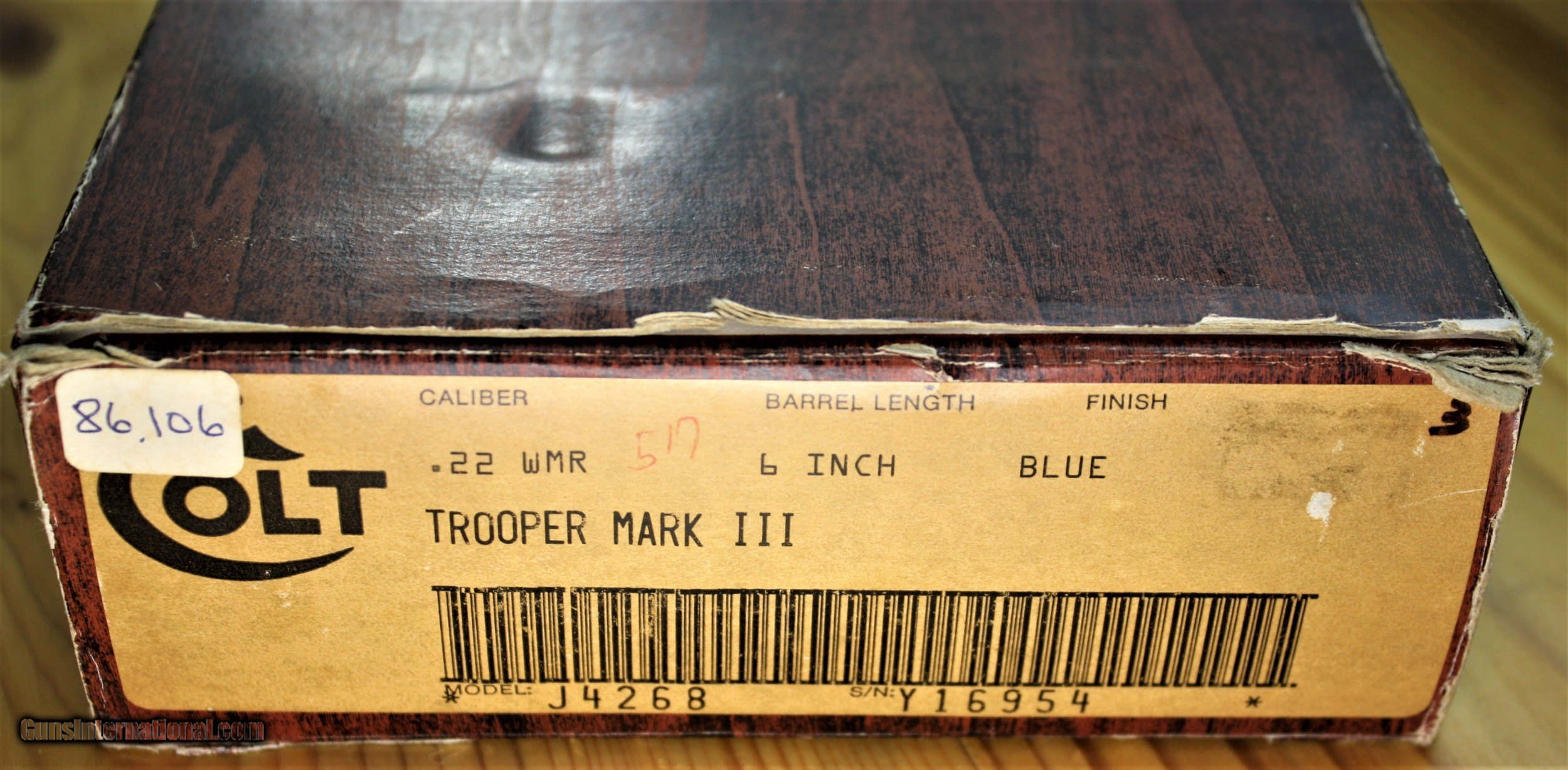 Description: This is a blued Colt Trooper Mark III in .22 WMR or .22 Mag. With it are the original box and papers. The box shows some wear as the pictures show and one side end flap is missing. The serial number is Y16964 and the revolver was made in 1980. It has a 6 inch barrel with solid rib and target sights. I has very slight cylinder turn marks. Those are the only marks I can find on the revolver. It appears unfired by looking at the face of the cylinder. The grips are in excellent condition and the hammer show its case colors. I bought this revolver to have one to shoot but it is such nice conditon that I dont want to shoot it. It needs to be in someones collection that appreciates the condition it is in. Shipping is $35. SOLD Curio/Relic: Yes Handgun Caliber: .22 WMR (.22 Magnum) Manufacturer: Colt Model: Trooper MK III Serial Number: Y169564 Barrel Length: 6 Condition: excellent |