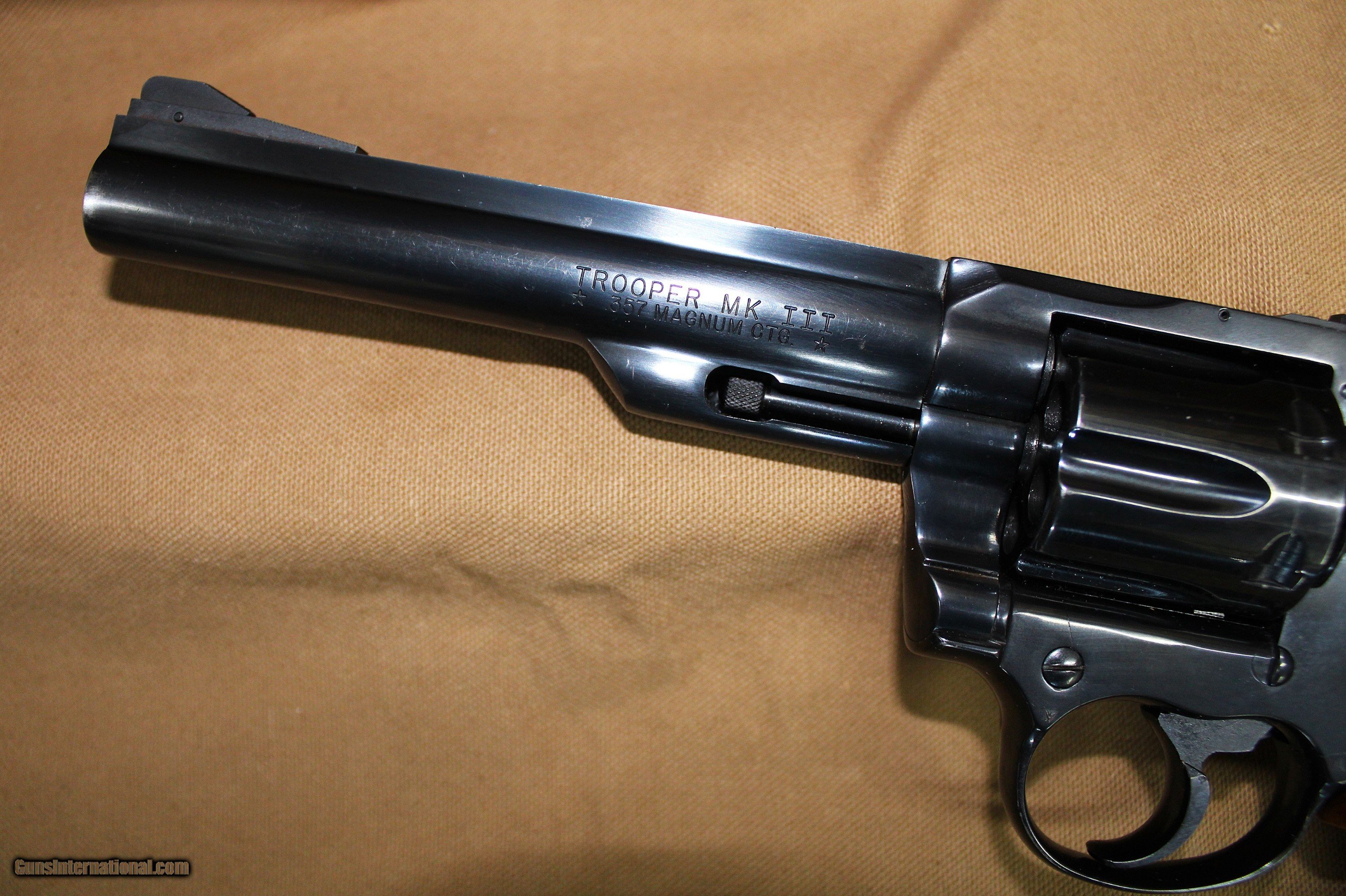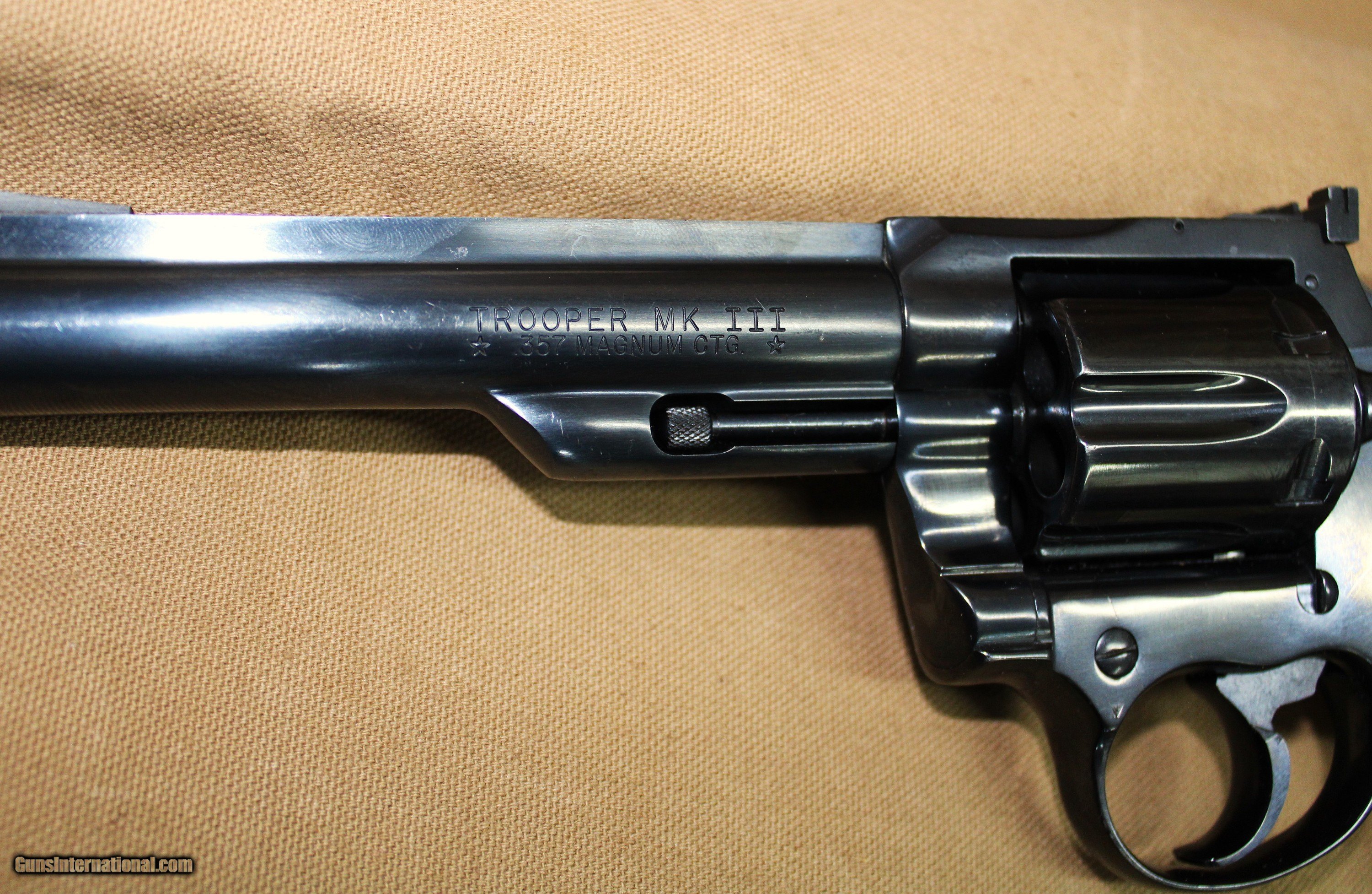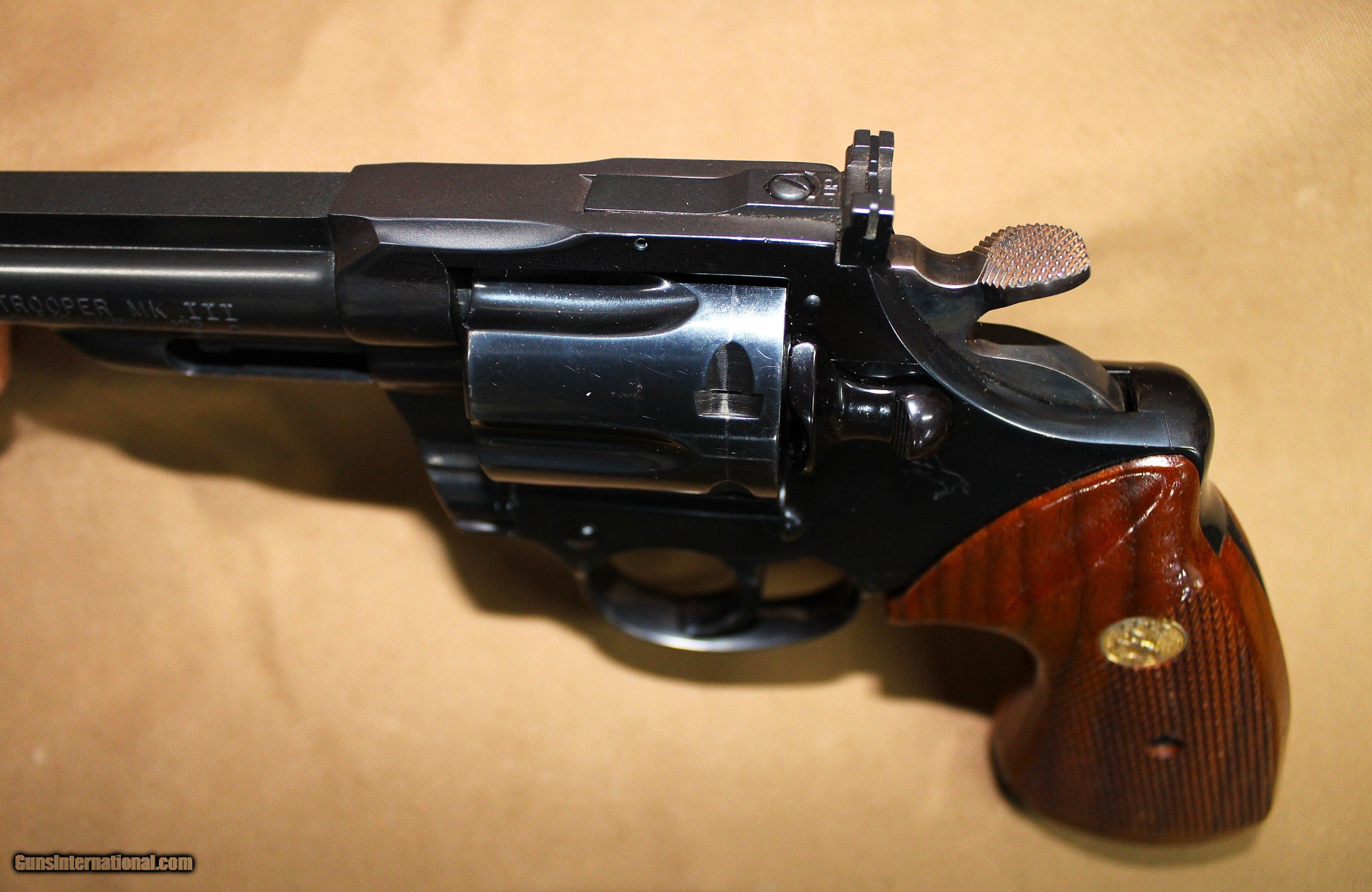 Description: This is a very nice Colt Trooper MK111 - it is a 6" blued gun, with a bright, shiny bore bore, and excellent action. This gun has been fired very little. It shows just a very slight cylinder turn line, slight muzzle wear and a few minor marks at the butt of the grips. I'm not exactly sure when this revolver was manufactured - MK111's were made from 1969 - 1983, the serial no. is 57878L. Overall this is a great Colt, a good all around gun to have, very versatile. This is one to shoot that will still maintain it's value. ***** This is a modern gun, it must ship to a FFL - please know your local laws. Shipping includes full insurance. Check or certified funds preferred ***** Thank you Handgun Caliber: .357 Magnum Manufacturer: Colt Model: Trooper Serial Number: 57878L Barrel Length: 6 Condition: Excellent Metal Condition: excellent Bore Condition: excellent Price: $1,175.00 Shipping: $75.00 Contact Seller |
