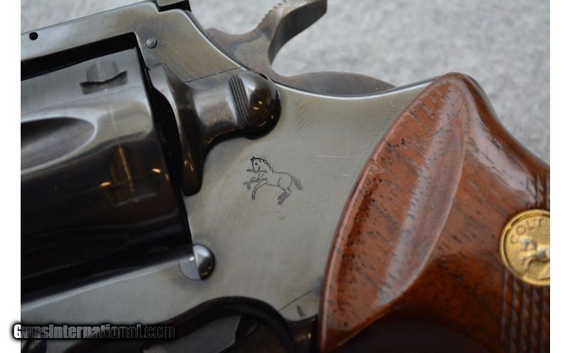 Description: Very good shape overall. The bluing is in exceptional shape. It is either original or a well above average re-blue, as both the Colt logo and the barrel markings have great definition. There is a drag line on the cylinder typical of use as well as a tiny patch where it looks like the revolver was set down on something rough; these are both minor. A light V-shaped scratch is found between the grip and pony; but only the point can be barely even felt. Grips are in good shape with the checkering in good condition; despite some handling marks. Sources indicate 1960 as the year of manufacture. .357 Mag SOLD Chambers: 6-Shot revolving cylinder. Metal Condition: Very good. Wood Condition: Grips are in very good condition. Bore Condition: Excellent. Barrels: 4" Blued. Triggers: Wide blued metal with smooth face. DA/SA Stock Dimensions: N/A Fore End: N/A Butt Pad: Checkered wood grips with Colt medallions. Weight: 2lbs 8oz Sights: Front ramped blade and adjustable rear notch. Chokes: N/A Item Location: Green Bay |