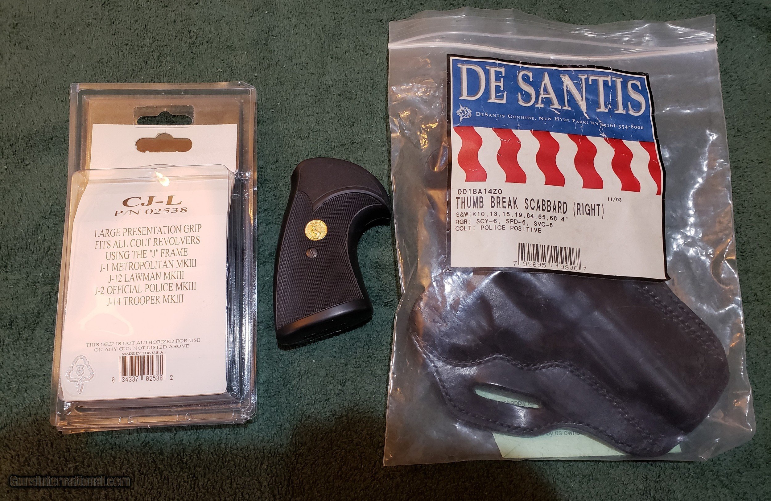 Description: ( Price drop.) Free shipping ! A great vintage classic. Colt collectors. Colt Trooper MK III .357 mag, 4 Inch barrel, blue finish. MFG 1974. Revolver is all original as it left the Colt factory 50 years ago. Colt Trooper MK III .357 mag, 4 Inch barrel, Colt Royal Blue finish. ...Excellent condition. Included an extra set of Colt medallion Factory Pachmayr J Frame Grips. Just added. 1. Desantis leather thumb break scabbard holster RH color black... Brand new in package never used. 1. Set of Pachmayr large presentation grips CJ-L for Colt J frame revolvers new. 1.. HKS M3 Revolver Speed loader. Not in pictures. (Revolver is in excellent nice clean condition for being 50 years old as pictures show. No box or papers.) Not many Colt Troopers around in this condition for sale with all these added accessories. MA compliant. (No sales to CA. ) Free shipping! (Local sales available.) Payment by US Postal Money Order, Certified Bank Check or Bank Cashier check. No electronic Payments accepted. Price firm. Not interested in any trades. CONUS only. ( Also check out my other Vintage Classic revolvers that I have for sale on Guns International.) SOLD Handgun Caliber: .38 Special, .357 Magnum Manufacturer: Colt Model: Trooper MK111 Barrel Length: 4 inch Condition: Excellent Metal Condition: Excellent Wood Condition: Mint Bore Condition: Excellent Manufacture Date: 1974 |