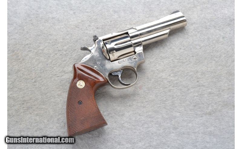 Description: This Colt Model Trooper MK III is a 6 shot nickel plated double action revolver in .357 Cal. It has a 4 inch barrel with a solid rib. A blade front and an adjustable notch rear sight. The grips are diamond checkered walnut with golden Colt horse medallions. This classic Colt revolver is in good condition. SOLD Manufacturer: 1969 - 1983 Caliber Info: .357 Magnum Chambers: 6 shot nickel plated fluted cylinder. Metal Condition: Good. Has minor surface handling marks and finish wear on the right side especially. Wood Condition: Very good. Bore Condition: Good. Barrels: 4 inch nickel plated with a solid rib. Triggers: Single Action / Double Action. Stock: Diamond checkered walnut grip with golden Colt horse medallions. Weight: 38 oz. Sights: Serrated ramp blade front. Adjustable notch rear. Item Location: Richfield, WI |