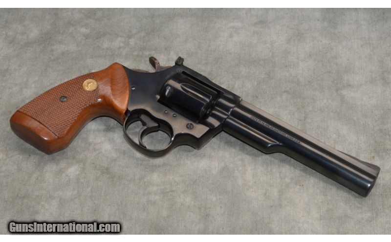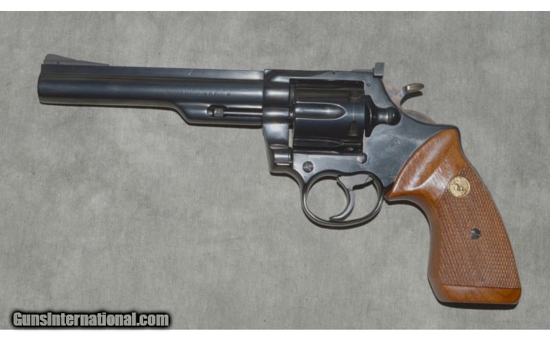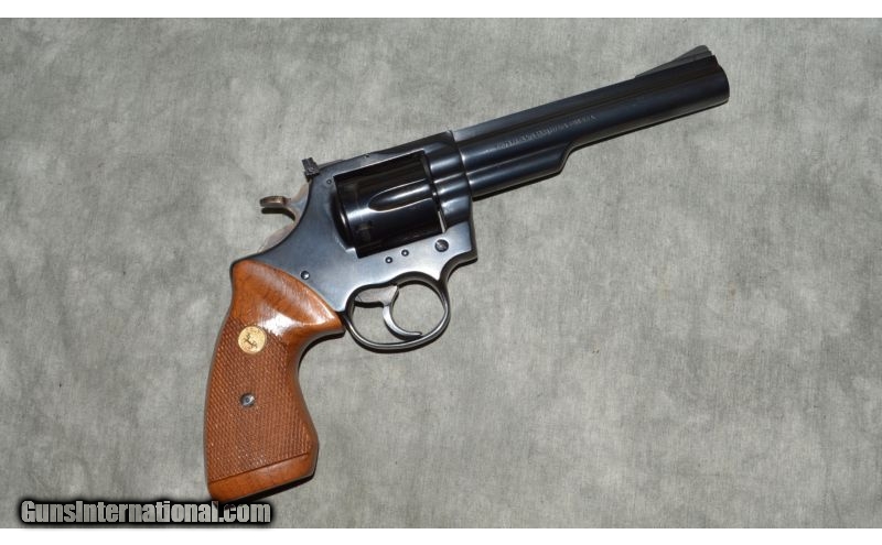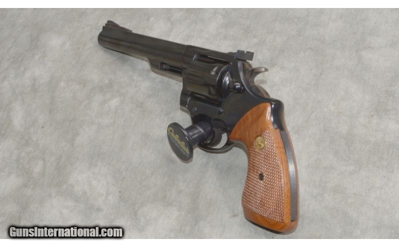 Description: Presumably the "practice pistol" match for the .38/.357 Trooper, this one features .2 WMR chambering, 6-inch bbl, complete blue, and target adjustable sights, as well as rebated stocks with a "pinky cut-out" at the front of the grip. SOLD Caliber Info: .22 Winchester Magnum Rifle (WMR) Chambers: 6-shot revolver Metal Condition: Excellent. Light turn line and has een fired but well cared-for Wood Condition: Excellent. Two small dents above Colt medallion on right side. Checkering sharp. Bore Condition: Shiny and bright. Barrels: 6 inch blued Triggers: Wide smooth trigger. Stock: Checkered walnut Weight: 47 oz. Sights: Serrated ramp and adjustable notch target sights Item Location: Rogers,, MN |