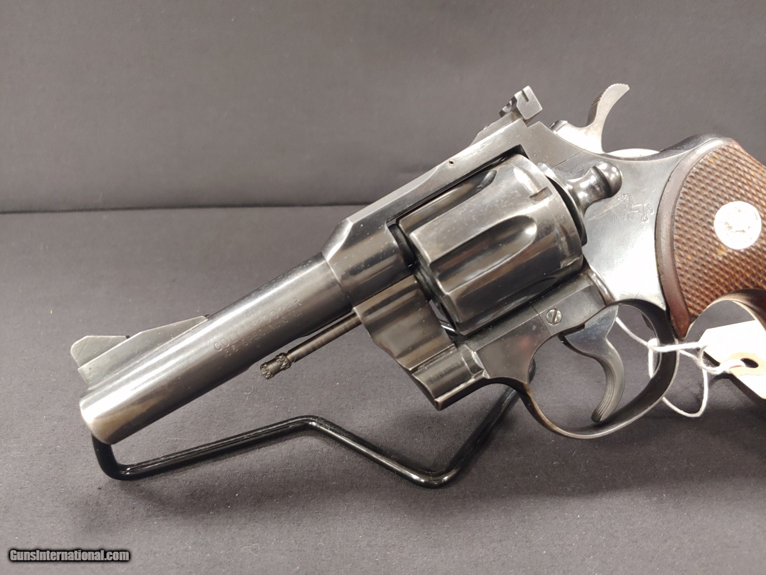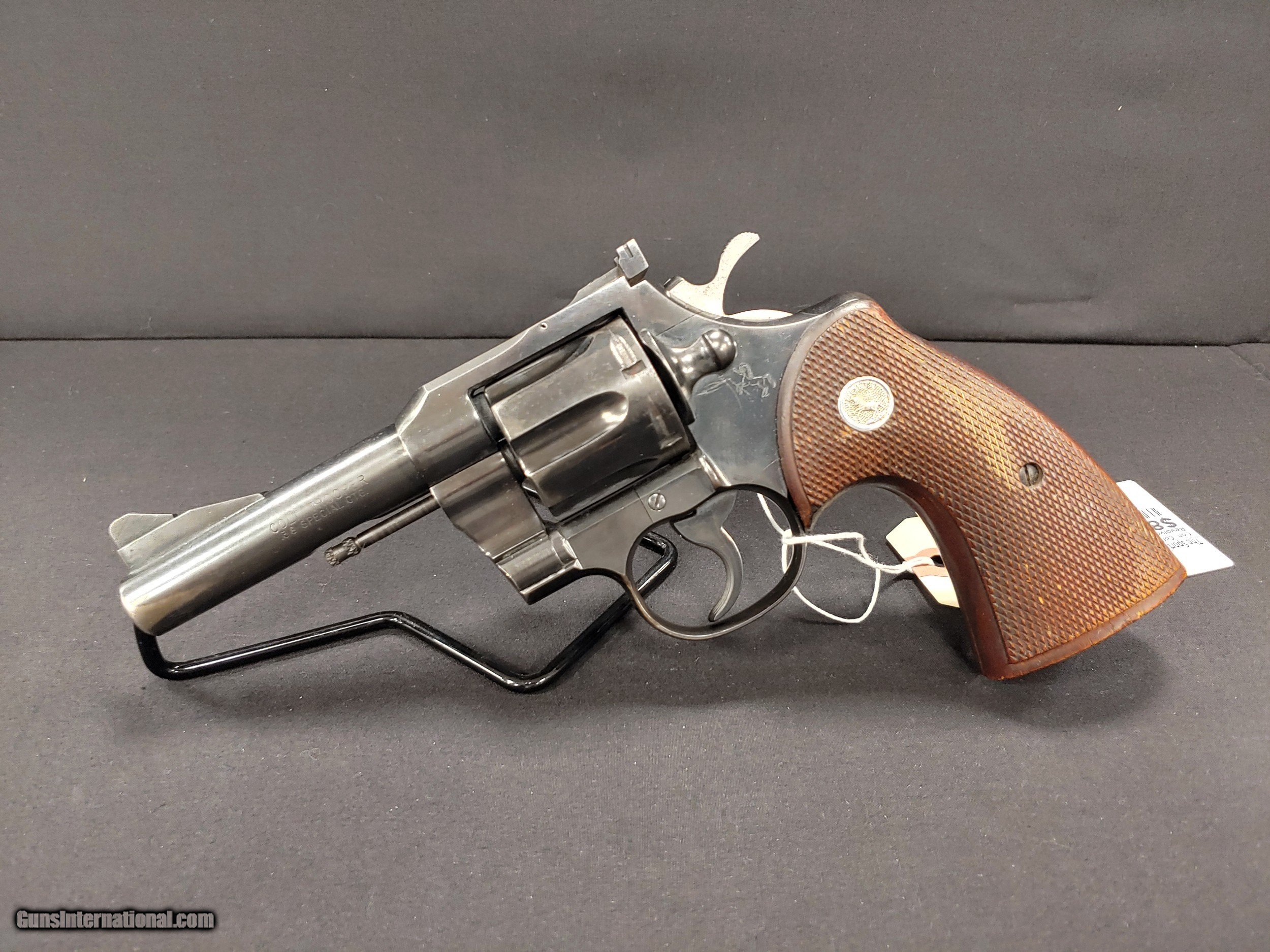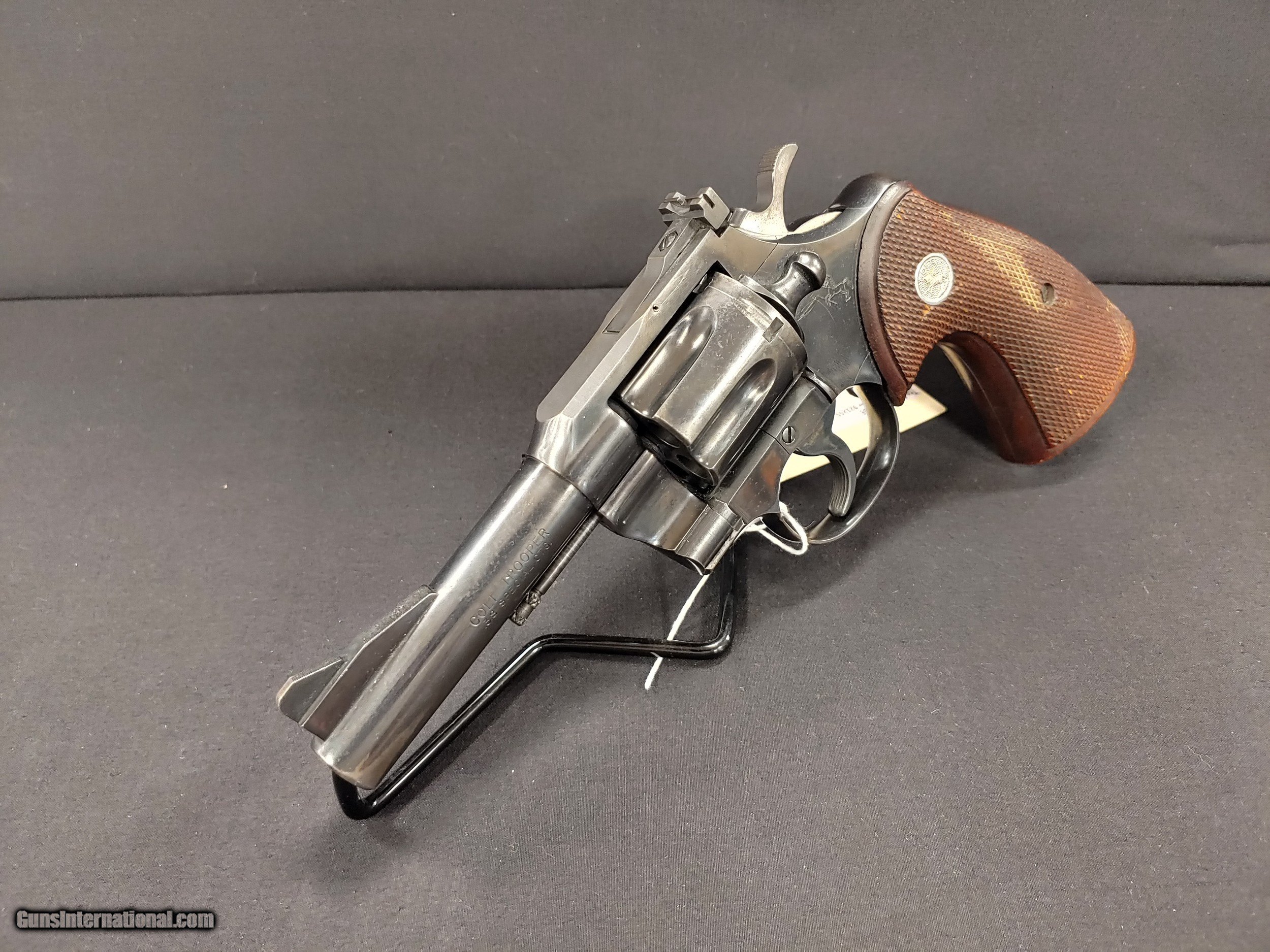 Description: This Colt Trooper is a single/double action revolver with a 3" barrel, chambered in .38 Spl. It has a blued finish, walnut grip with Colt symbol, adjustable rear sights and ramped front sight. The blue on the barrel is wearing off and it has some rust spots on the right side but the gun is in otherwise good condition. The overall length is 7" with a height of 6".