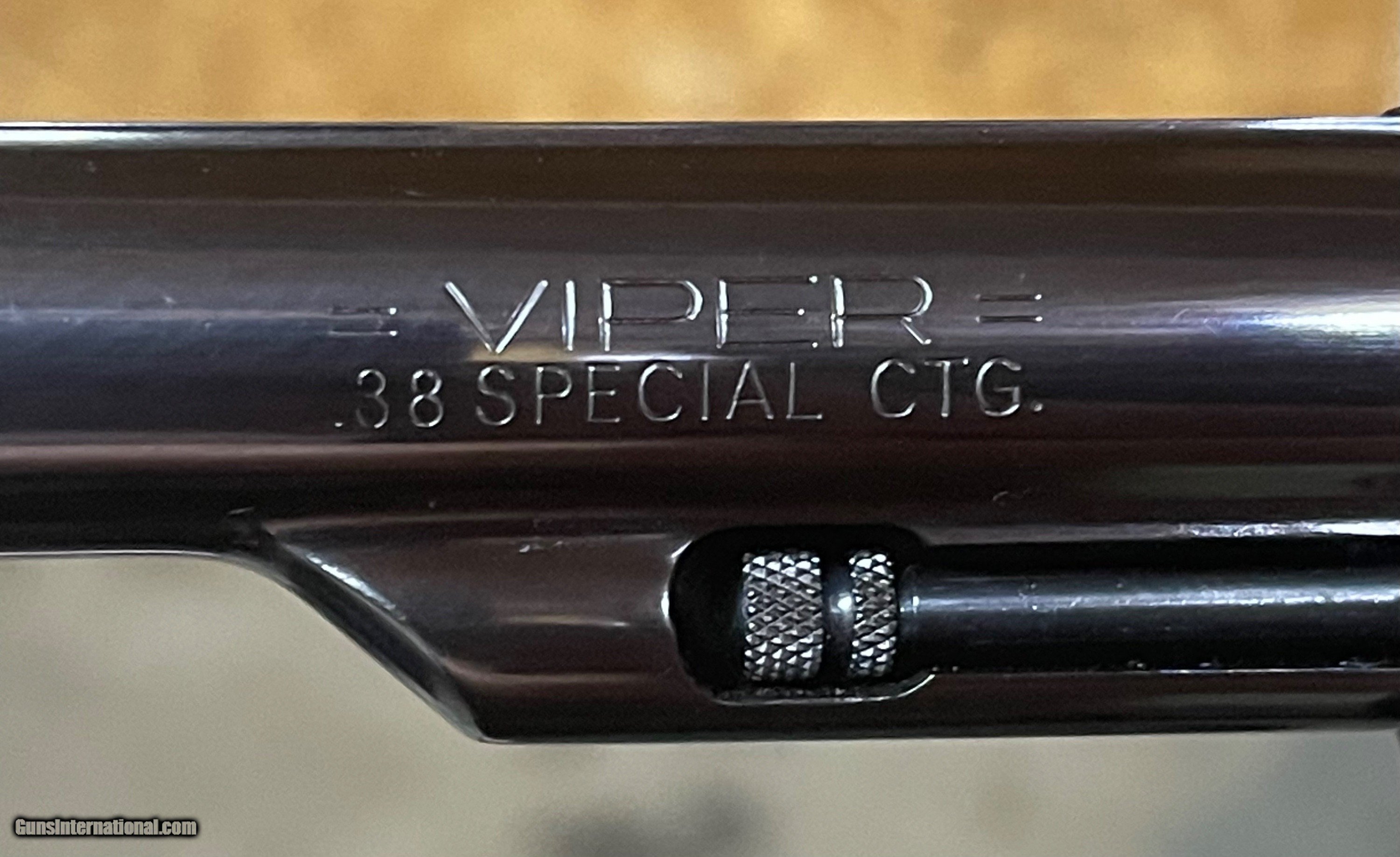Description: Wow! This viper is in unfired pristine condition. 4 inch steel barrel, blue finish, alloy frame, steel cylinder, and wood grips. NO BOX. Reproduction boxes are available online. A centerpiece for any colt collection! Please email with questions. Shipping and insurance included. SOLD Manufacturer: Colt Model: Viper Barrel Length: 4 inch Condition: Mint Metal Condition: Excellent Wood Condition: Excellent Bore Condition: Excellent Action: Da, sa Finish: Blue Manufacture Date: 1978 Item Location: 37075 |