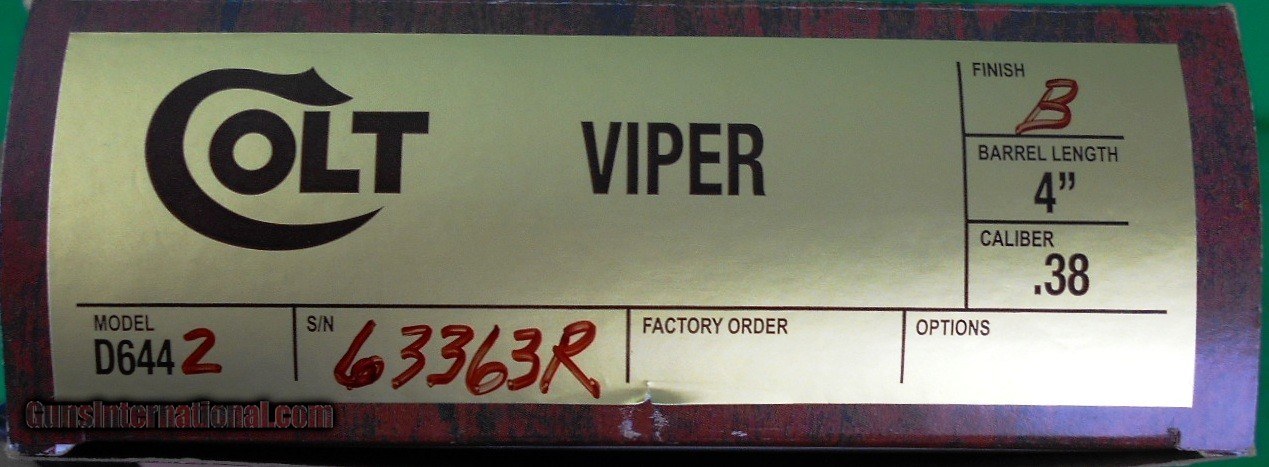 Description: Colt Viper in 38 special with factory box and paperwork. Revolver is in great working shape. It has been well taken care of and shows blueing and wood wear from carry and use. Serial number is 63363R. Multiple holster wear marks on bluing and a crack in left side grip. Bore is shiny and rifling crisp - action is smooth in both double action as well as single action. Please feel free to ask questions or for additional pictures. Firearm is for sale locally. Shipping and insurance will be determined for buyer - price reflects a cash discount - add 3% for Mastercard/Visa/Discover - payment arrangements must be made within 3 days of end of sale SOLD Handgun Caliber: .38 Special Manufacturer: Colt Model: Viper |