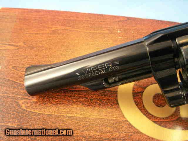 Description: SOLD PENDING FUNDS: For Sale: Colt Viper Revolver manufactured in 1977 only. This is one of the rarest "Snake" guns to find and was similar to the Police Positive revolver (Fourth Issue) except it incorporated an alloy frame. It is in the .38 special caliber with a 4" barrel. Condition is rated at 99%+ all original and comes with it's original numbered box and papers. This particular gun is pictured in the book "Colt and Its Collectors" on page 173. A great "Snake Gun" investment and a must to complete a collection of double action snakes. SOLD |