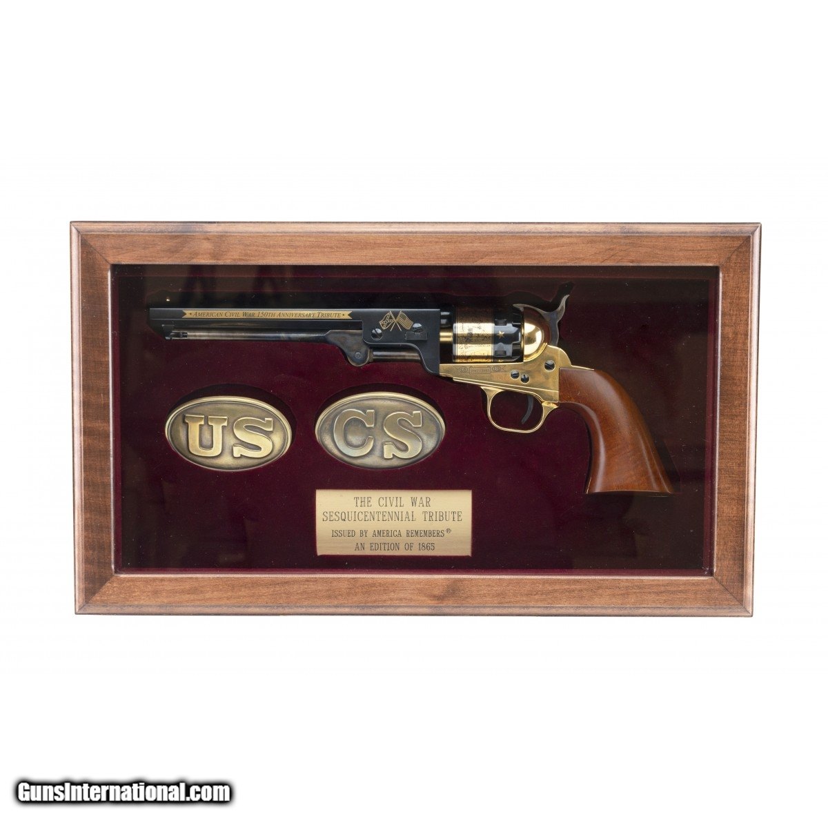 Civil War 150th Anniversary Tribute revolver issued by America Remembers. Has gold engraving and comes with a U.S. and a C.S. belt buckles, in a glass top wooden presentation case.