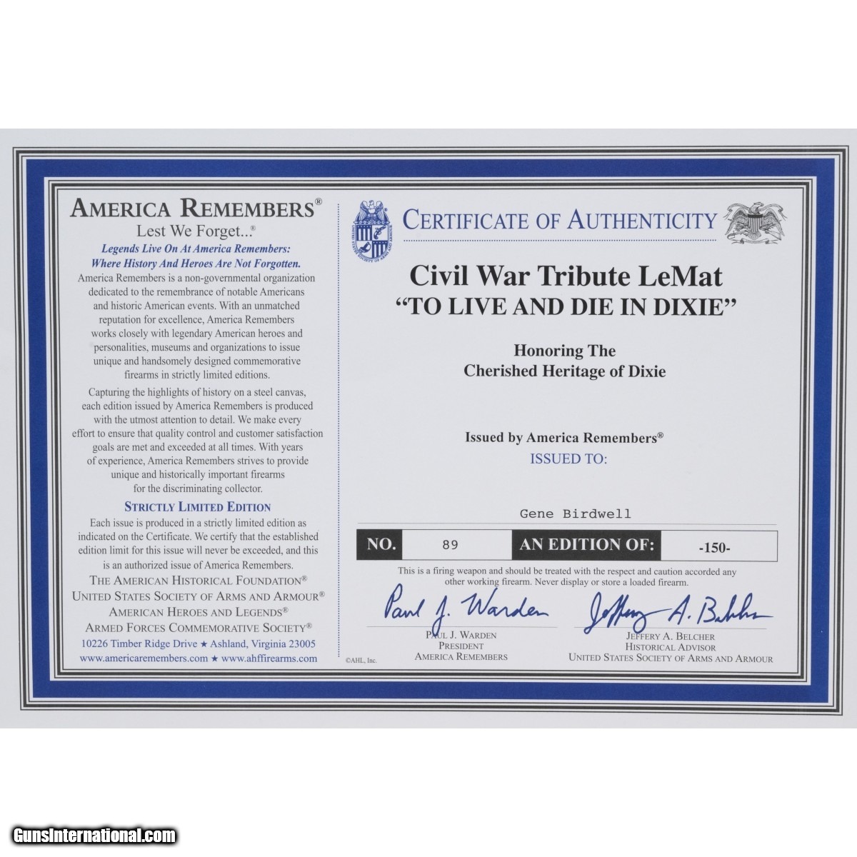 Description: " Gorgeous Civil War Tribute LeMat Revolver with a high polish engraved finish and display box. Part of a limited 150 piece run. SOLD |