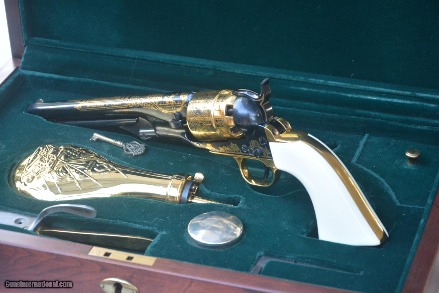 Description: This a colt 44 comemorating Buffalo Bill cody this is as new in the box in unfired condition, is adorned with 24 kt gold plating Faux ivory geips just a beautiful revolver come complete wiyj Powder flask nipple wrench cap tim and xase colored 44 ball mold. walnut box even has a lock and key.............this is one of 2500 produced in 1983 by the famous American historical society,,,,,, comes with instrutions.............can ship to your front door ....i ship world wide,,,,, SALE PENDING SALE PENDING THIS IS GOING TO PARIS FRANCE SOLD Curio/Relic: Yes |