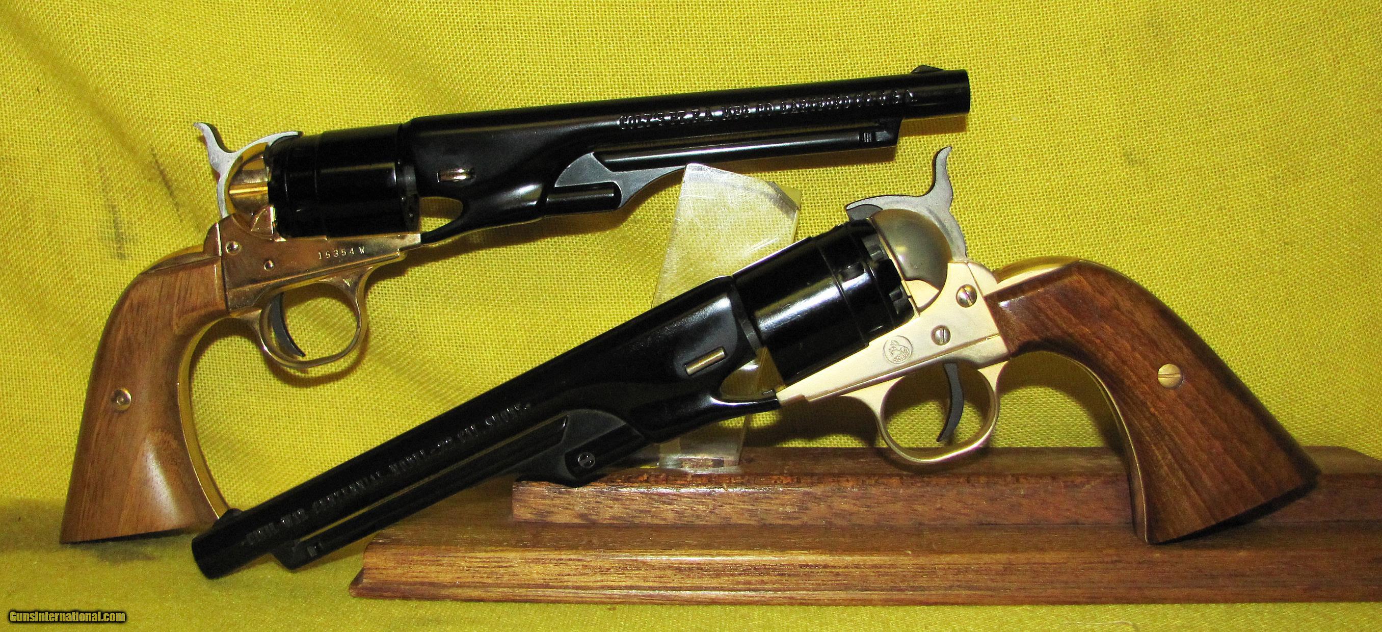 Description: COLT CIVIL WAR CENTENNIAL (PAIR) IN .22 SHORT CAL., WITH 6" BARREL. COLOR GOLD/BLUE. CONDITION 98%+. SERIAL NUMBER 15353W/15354W. COLT MODEL CIVIL WAR CENTENNIAL PAIR OF SINGLE SHOT REVOLVERS, BLUE BARRELS AND CYLINDERS ARE BRIGHT AND SHINNY, BRASS FRAMES AND BACK STRAPS WITH WALNUT GRIPS ARE EXCELLENT, NO BOX, (THE PAIR). OUR NEW STOCK # D31973/D31974. SOLD |