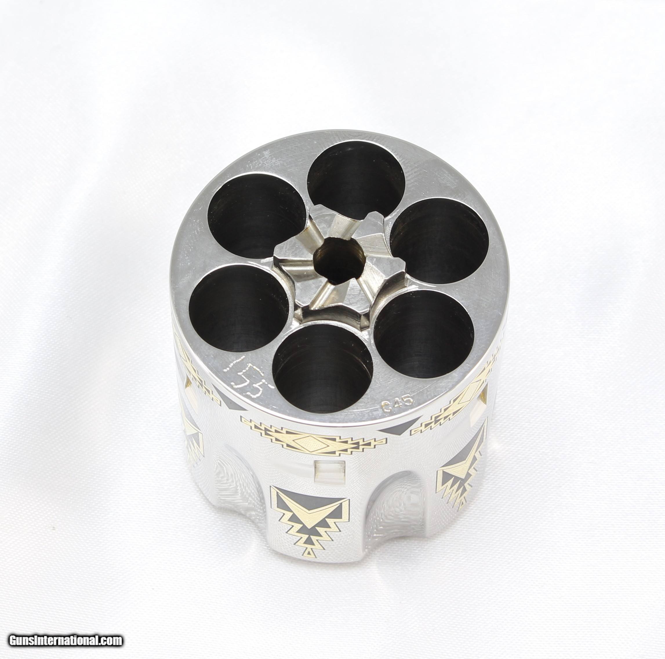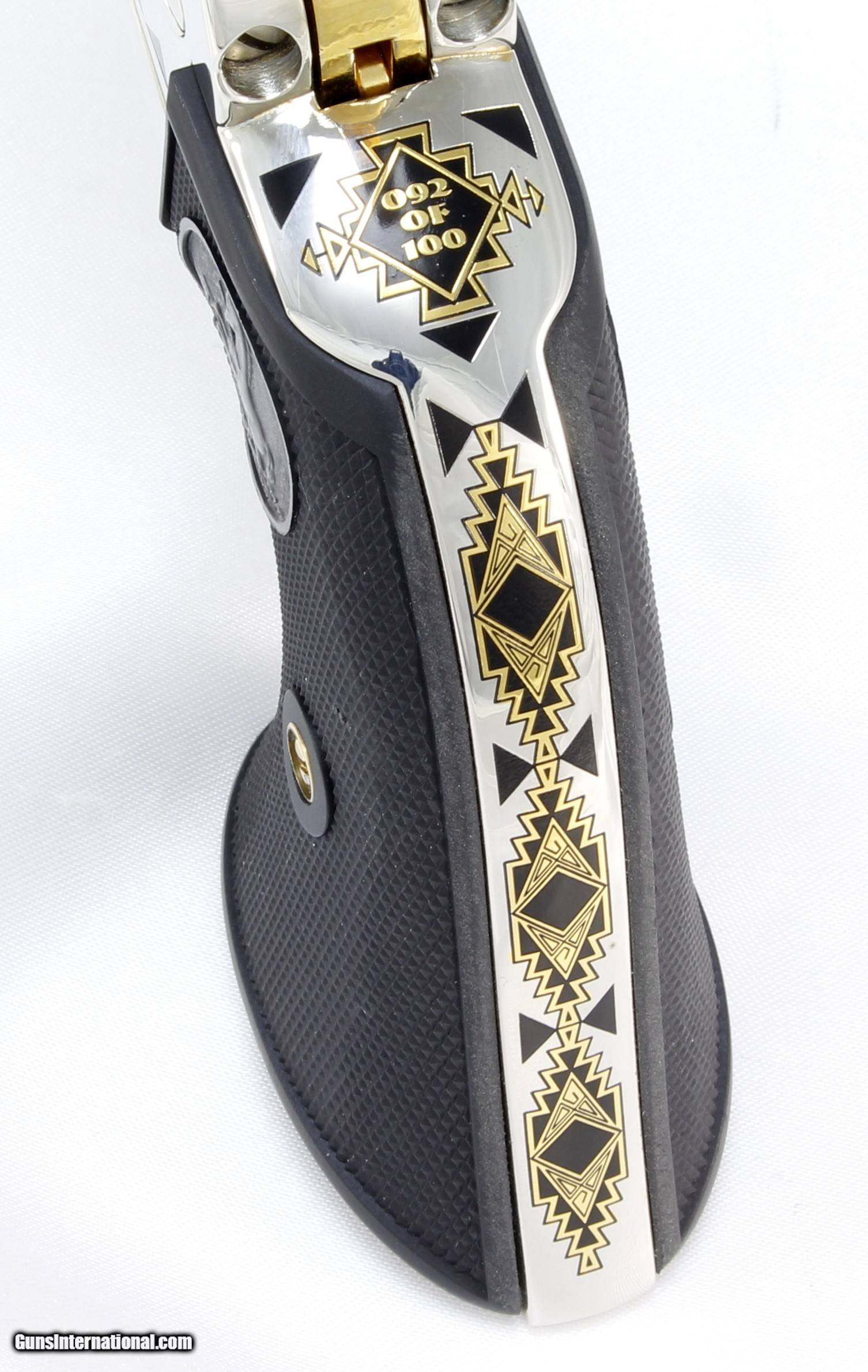 Description: COLT SAA, 5 1/2" Barrel, 45LC, "GERONIMO COMMEMORATIVE". SN# TF08257, MFG: 1990'S. Only 100 Made, Engraved by A & A Engraving, Rapid City, SD. Special Addition of Only 100 Guns, by America Remembers. An Exceptional GERONIMO TRIBUTE COLT REVOLVER. NICKEL WITH GOLD AND BLACK ACCENTS. Gun Appears as New. Ships to Lower 48, w/Insurance: $40.00 SOLD Manufacturer: COLT Model: SAA COWBOY Serial Number: TF08257 Caliber Info: 45LC Bore: LNEW Condition: LNEW Metal Condition: LNEW Barrels: 5 1/2 |
