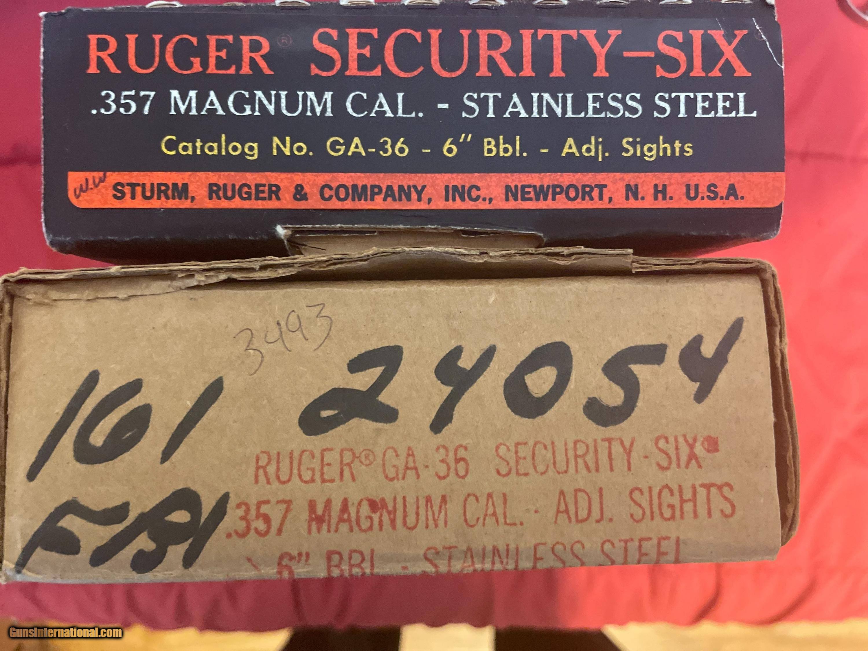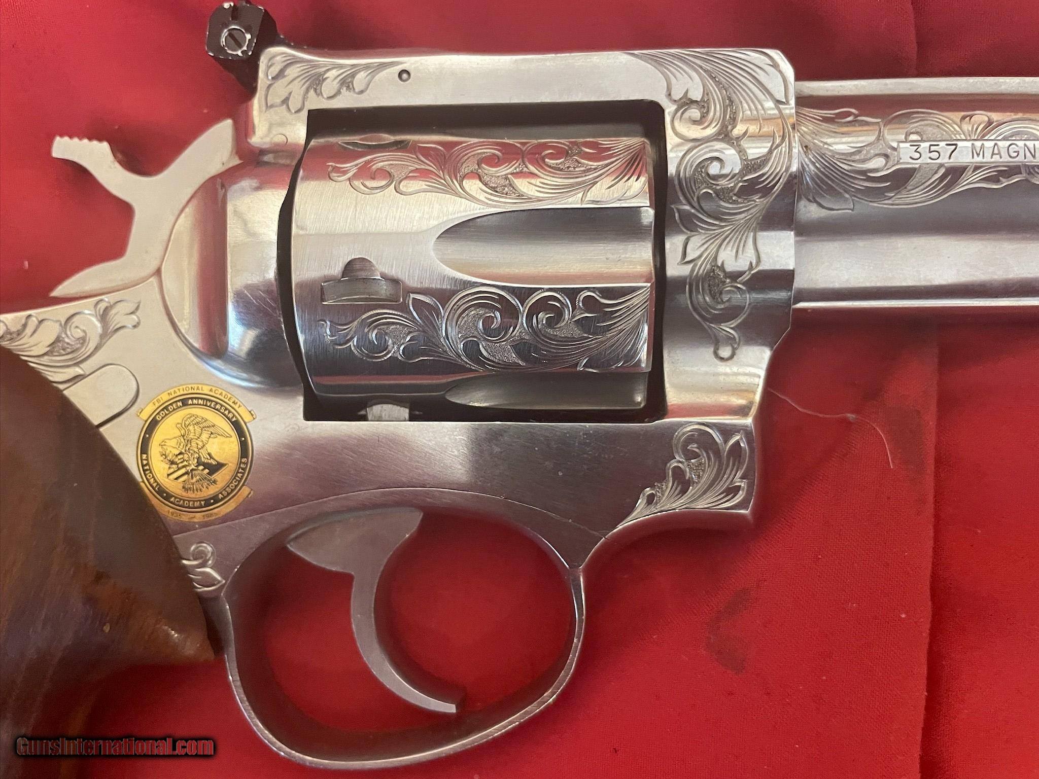 Description: Ruger Security Six FBI National Academy Golden Anniversary Commemorative Double Action Revolver with case, manufactured in 1985-88, with glass top presentation case, 6in. ribbed barrel, walnut grips, 2/3 engraved floral patterm on top of a stainless- steel body. Only 30 engraved by Ken Hurst [signed]. Excellent-like new. Fired less than 20 rounds. SOLD Handgun Caliber: .357 Magnum |