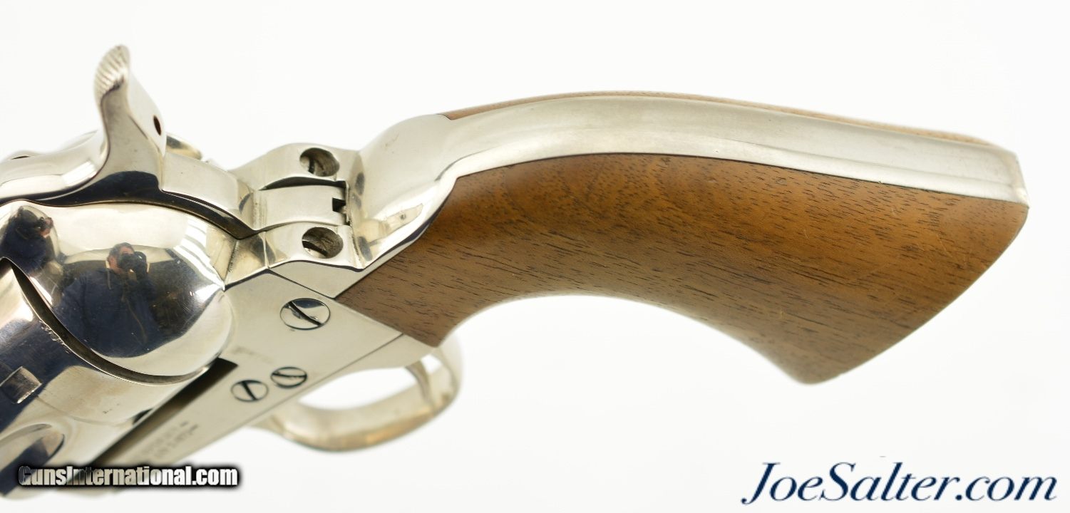 Description: Serial #L2979, .357 Magnum / .38 Special, 4.75 inch barrel with an excellent bore. This is the American Western Arms (AWA) "Longhorn" model single action army revolver made in Italy and marked "AWA Italy" under the barrel. In excellent condition it retains most, 95-97% of the original bright nickel finish with numerous light use marks and scratches with a mild turn ring. The smooth hardwood grips are likewise excellent, solid with some light use marks. Mechanically it functions properly with a tight lock up and crisp trigger pull holding at half and full cock. A great Cowboy Action gun that would pair well with item #47334! FFL; Click here for 47334 ; SOLD |