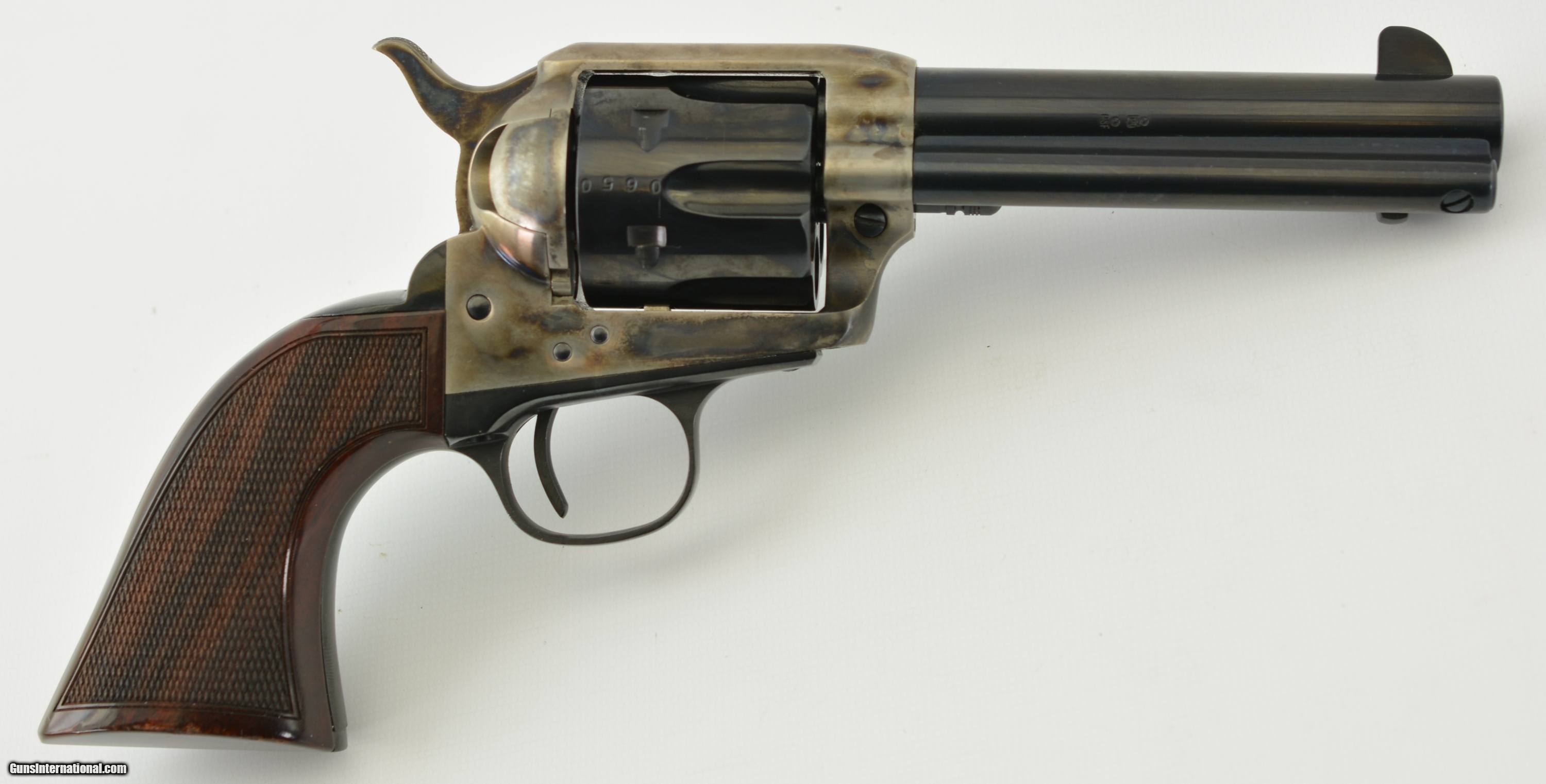 Description: Serial#'s TC0650, TC0651, .45 Long Colt, 4 3/4" barrels with bright, excellent bores. This is a consecutive numbered pair of single action pistols made by Uberti and customized by Taylors & Co. in Virginia. New in boxes this matched set has color case hardened frames, blued barrels and checkered hardwood grips. These guns have not been used since they left the factory and are perfect for the Cowboy action shooter. FFL SOLD Manufacturer: Uberti Model: Smokewagon Caliber Info: .45 LC Gauge Info: .45 LC |