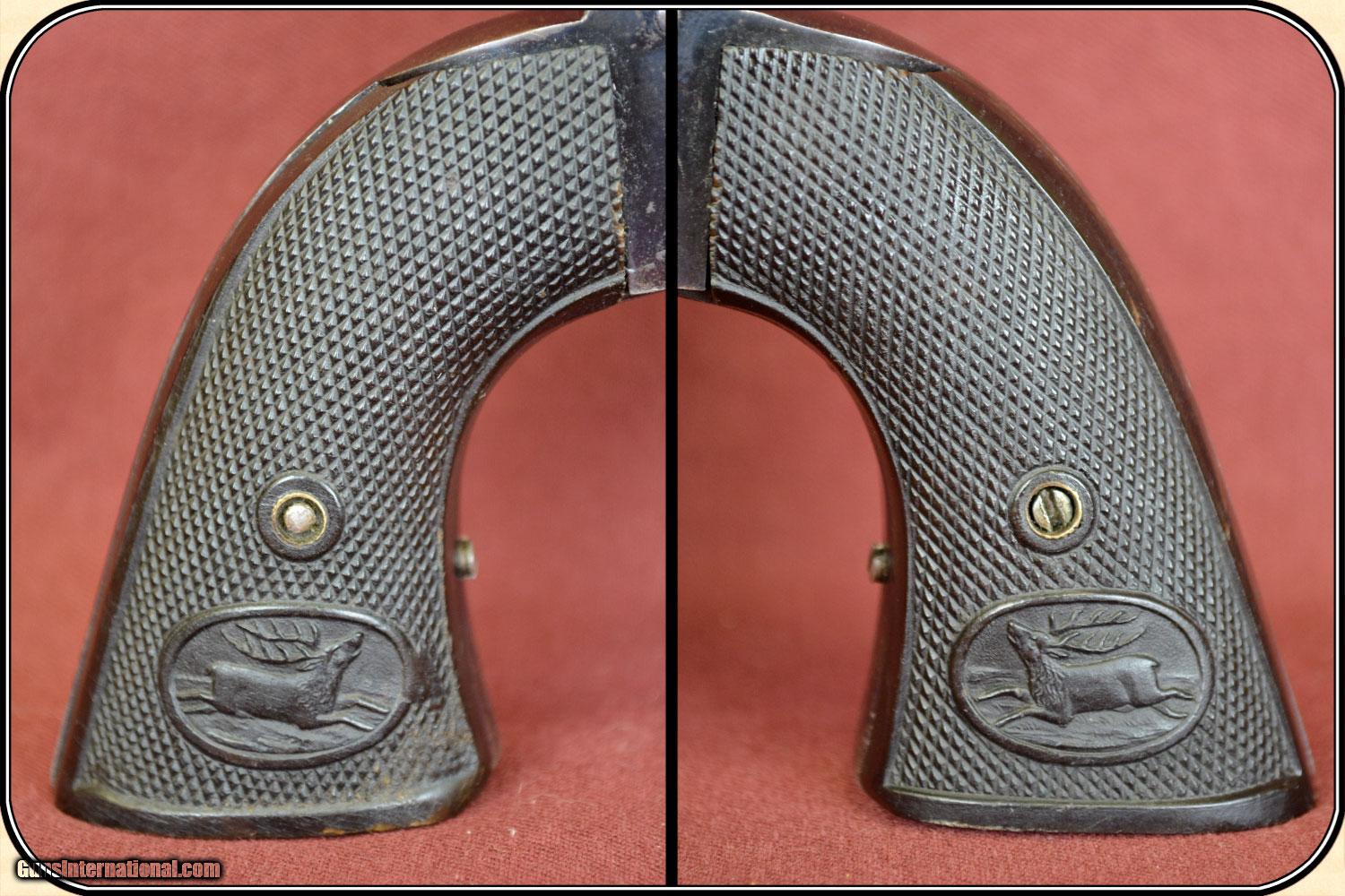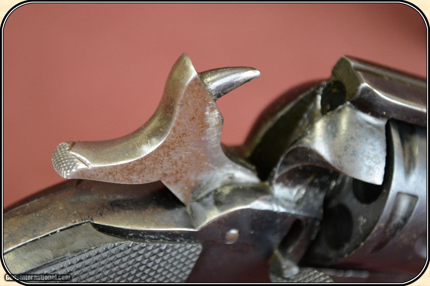 Description: This revolver was manufactured in Belgium by an unknown maker and is a copy of the Colt 1877 and was intended to compete with the Lightning and Thunderer, It was marketed in the US in the late 19th century. It is a better gun than the Colt. Mechanically it stands up much better. It is a 6 shot double action with a 5 inch Barrel. The finish shows 95% original blue. The original grips are perfect with no chips or cracks. The bore is bright and shinny with no pitting and very strong rifling. It is mechanically perfect and lock up is tight. Chambered for the rare .32-20 Colt Cartridge. There are manufacturers of Cowboy Action Shooting ammunition that produce this cartridge. The top of the barrel is marked "TEXAS RANGER FOR .32-20 COLT" On the right side of the frame it is marked "32-20 W". Which likely stands for WCF meaning Winchester Center Fire. It has the look of a small Colt SAA. It shows no serial number. It is an antique and can be shipped directly to you. Adult signature require. PAYMENT Cash, postal money order, cashiers check, personal & business checks. May order at riverjucntion on-line with credit card. SOLD |