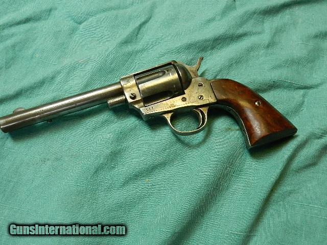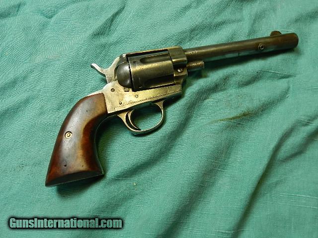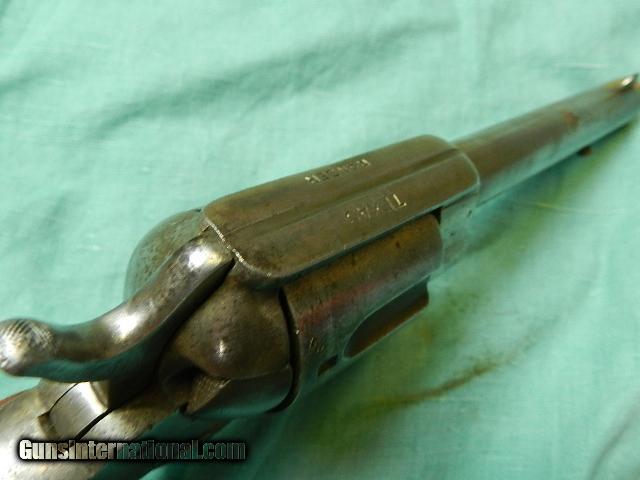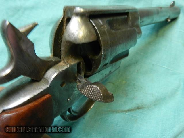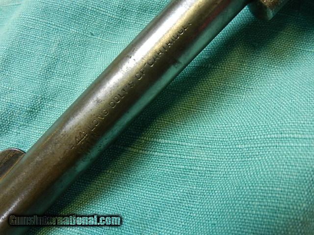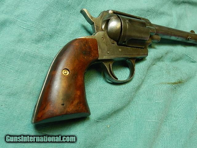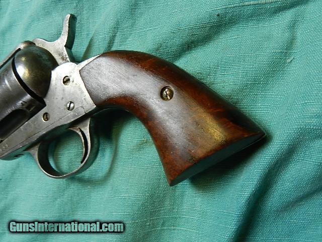 Description: Well used and working old cowboy gun in ..44 cal, black powder cartridge. .Action is working,but cylinder stop isn't tight, comes with aged smooth crotch grain figural grips with patina, and wear, no serious damage.Finish is smooth grey medal,with patches of brown patina, and some original not bad for an old gun. This is a real cowboy gun from the southwest, not a toy. No other markings on the gun, except on the left lower frame is the SN 111, and top of the frame says: TEXAS RANGER.. Left side of barrel : ..44 LONG COLT'S CF CARTRIDGE, and under neath .44 is stamped WIN! Looks like a cowboy gun made in Spain before the turn of the century for use in Mexico or the Southwest! !Barrel is 5 5/8", and considering age not safe to shoot. Needs an ejector rod and tube. To buy a gun from me you must get a direct email for me, with details, and shipping cost. We don’t have asite .I prefer money orders or a check. Item ships when funds come in. If you can only pay with a card let me know. I’m sorry I don’t list my phone number, did that for 30 days, never again.. I can’t talk on the phone all day…who will ship the guns? I’m just one person, and it’s very busy here! I do a brisk volume! I hope you like my wide selection of unusual guns, knives and gun parts. Shipping price determined by zip code. I try to keep the prices affordable, which means I make less money than most dealers. You won’t get altitude sickness with my prices! I consistently have the best selection of older guns If you attempt to buy, you must still contact us for details, buying doesn't end the sale, it just sends an email telling us you want to buy this gun. A phone call won’t secure a sale! Not home many times, the first buyer by email buys the gun !Thissite does not close down a sale when you do a BUY! I can get six buys in an hour, first buyer to email gets the guns, others are in second place! Best to send another email . Sometimes not home to get calls. Some guns are required shipment to a gun dealer near you for a transfer to you when it arrives. With the widest selection of older guns at great prices, We don’t have a store, and sell on the internet only. Thank You. SOLD |