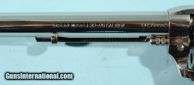 Description: DAKOTA NEW MODEL BISLEY .32-20 W.C.F. CAL. 7 ½” NICKEL SINGLE ACTION REVOLVER. Little used and in very near mint condition with 100% nickel finish. Walnut grips in perfect condition. Perfect working order. Very tight and cycles nicely. SOLD |