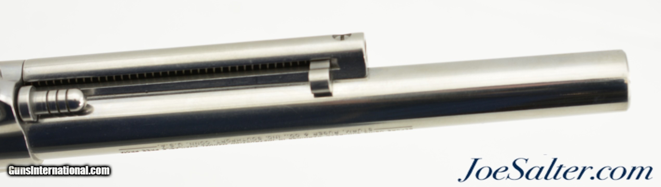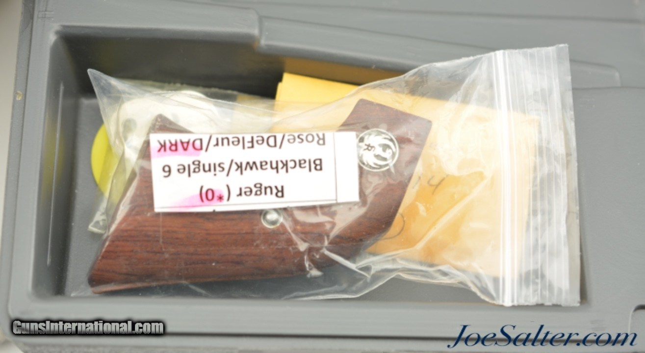 Description: Serial #56-13411, .44-40 Win, 7.5 inch barrel with a bright, excellent bore. This is the Ruger Vaquero revolver manufactured in 1996. In excellent condition the single action Cowboy gun retains virtually all, 98-99% of the original bright stainless finish with a very light drag line on the cylinder and mild use marks and holster wear. It comes with the original walnut Ruger grips and wears a pair of Altamont custom checkered Fleur-de-lis rosewood grips and both rate excellent, like new. It comes in an original Ruger gray plastic case with manual, lock and a spare lower profile front sight blade. A beautiful like new first generation Vaquero in a desirable caliber & perfect for the Cowboy Action shooter. FFL SOLD |