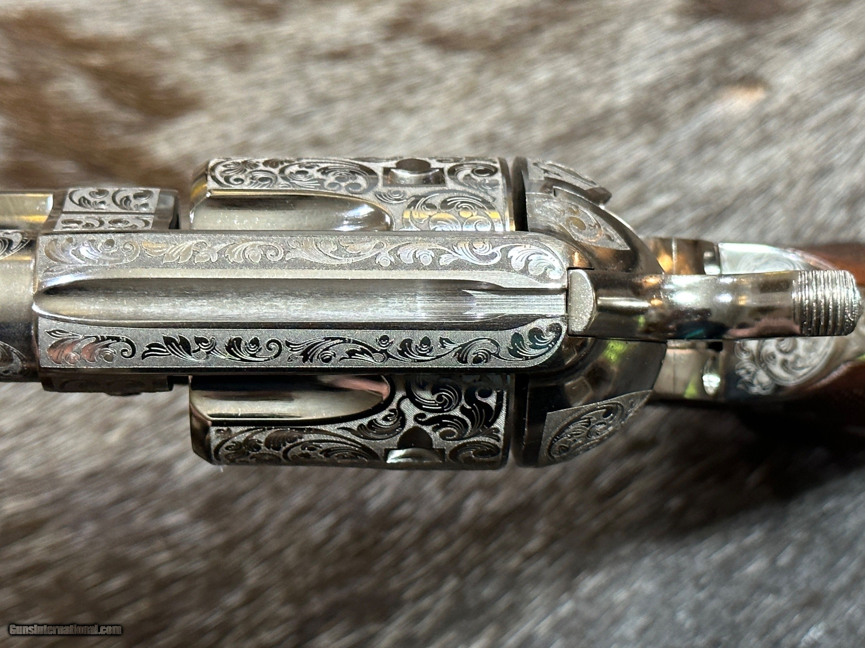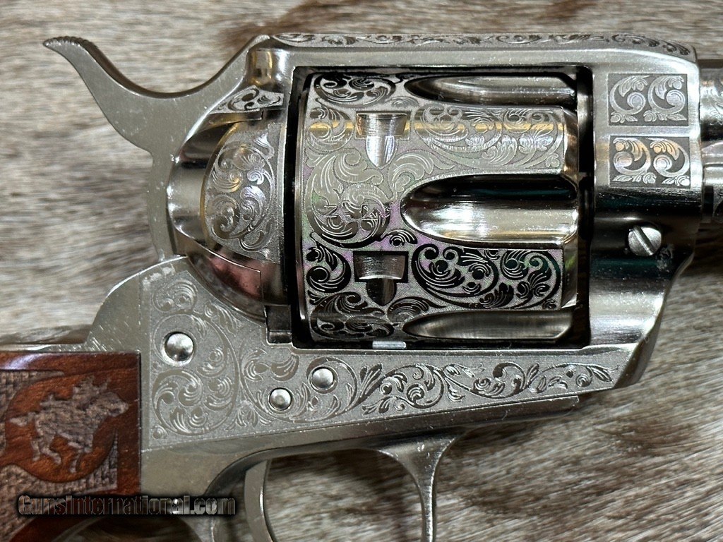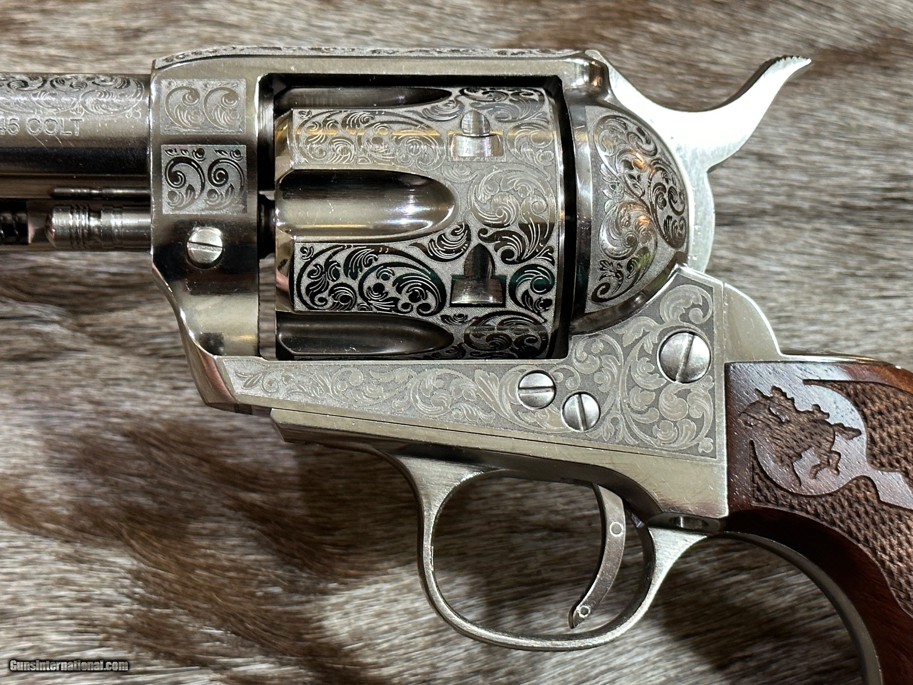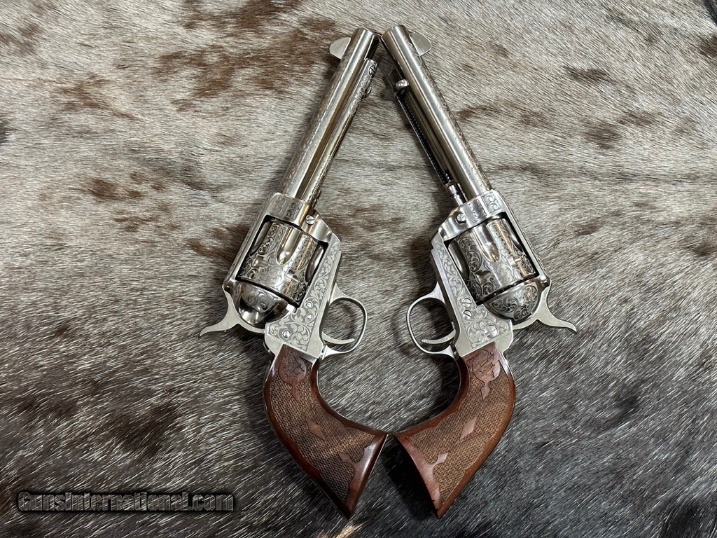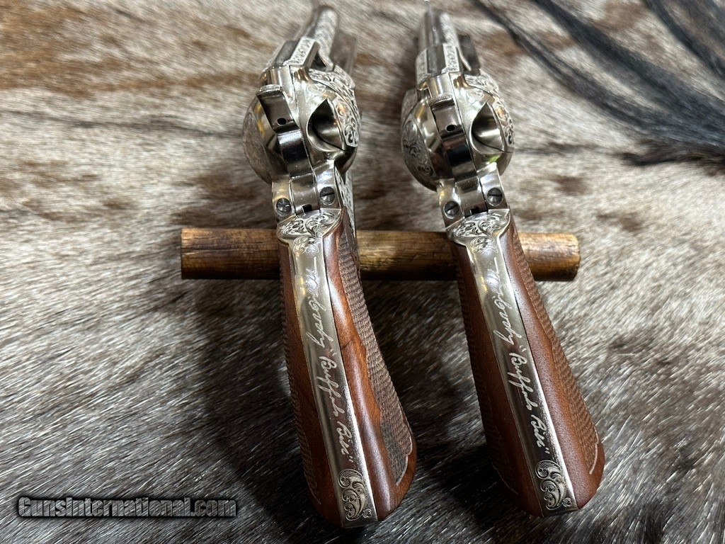 Description: NEW LIMITED EDITION PAIR OF CONSECUTIVE SERIAL NUMBERED 1873 45 COLT BUFFALO BILL CODY ENGRAVED NICKEL REVOLVERS WITH 5.5" BARRELS BY CIMARRON & PIETTA - LAYAWAY AVAILABLE FEATURES OF THIS FANTASTIC PAIR OF CONSECUTIVE SERIAL NUMBERED 1873 ENGRAVED NICKEL REVOLVERS INCLUDE: