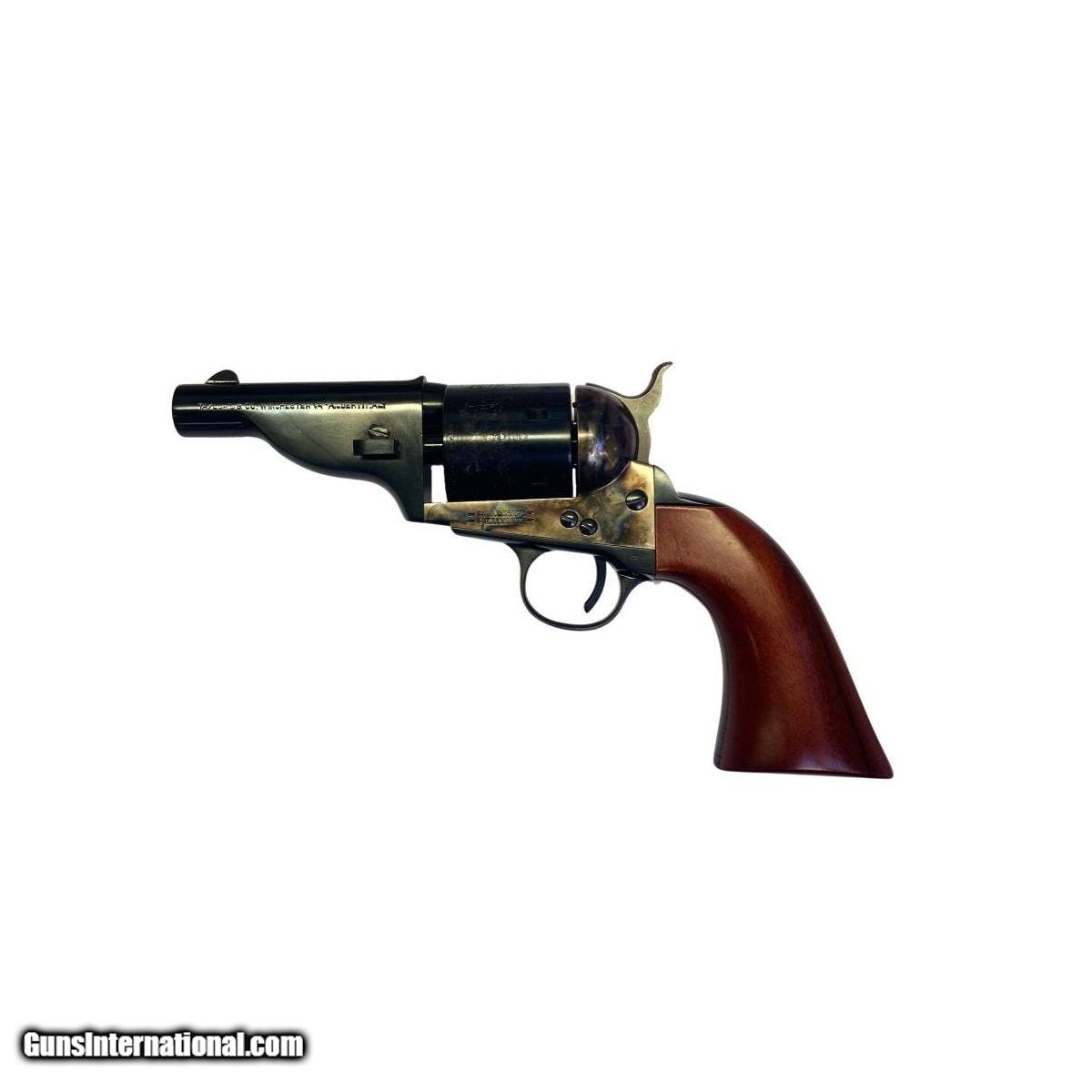 Description: Manufacturer: Taylor's & Co. Model: Hickok Conversion SKU: REV/9059 Caliber: .38 Special Capacity: 6 Rounds Barrel Length: 3.5" Finish: Case Hardened Weight: 2.82 lbs Grip: Walnut Sights: Blade Front, Rear sight on back of barrel Although it appears to be a conversion, the 1871-72 Open Top model was Colt?s? first revolver specifically manufactured to fire a centerfire cartridge by incorporating the loading gate in the frame. Since Colt? did not use percussion revolver parts, the revolver was manufactured as an entirely new model, first with Navy-sized grips, later with Army-sized grips. The Hickok model is a modern twist on the classic Open Top that features a snub nose barrel. This model features a case-hardened forged steel frame, round barrel with front blade sight, no ejector rod, blued steel grip parts, an Army-sized walnut grip, and a rear sight notch on the rear of the barrel. SOLD |