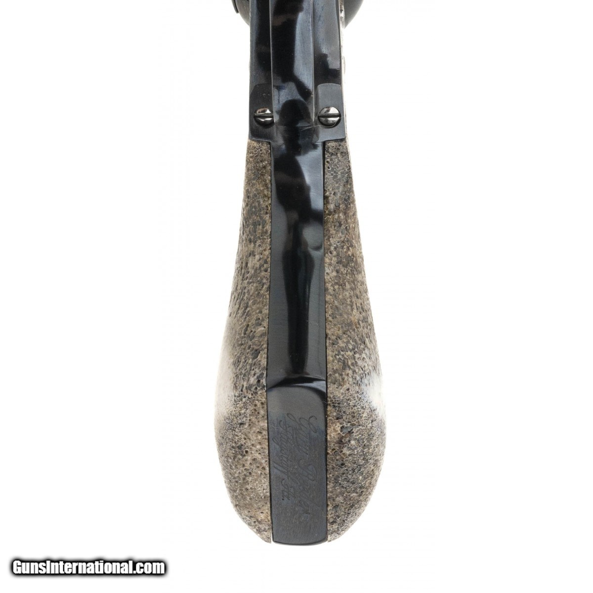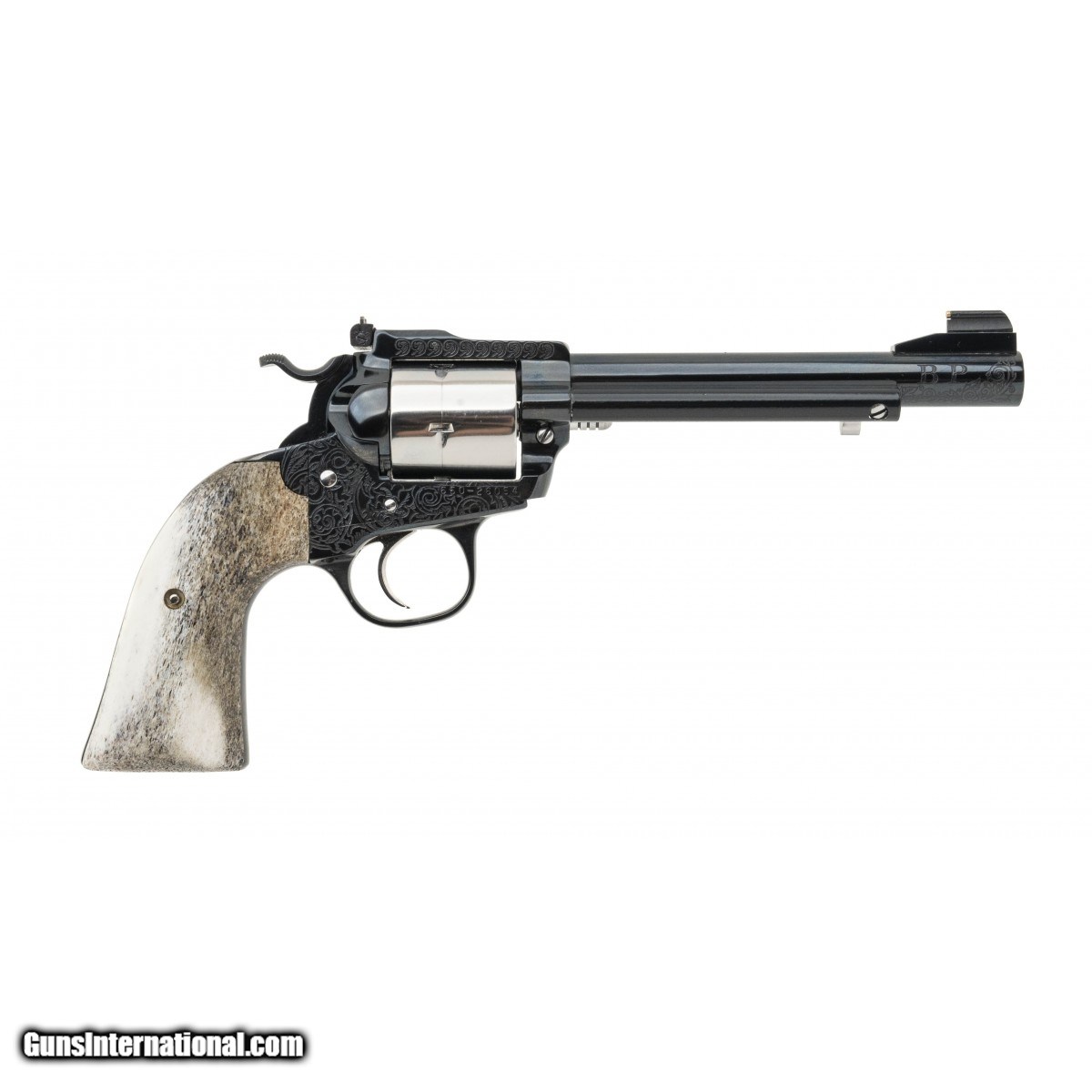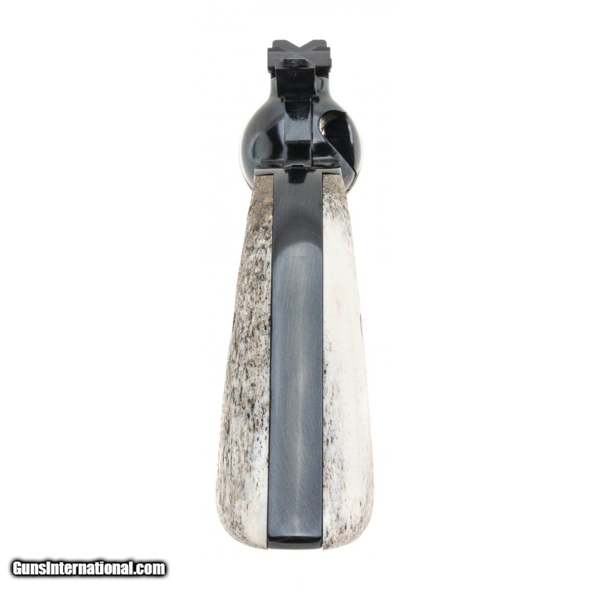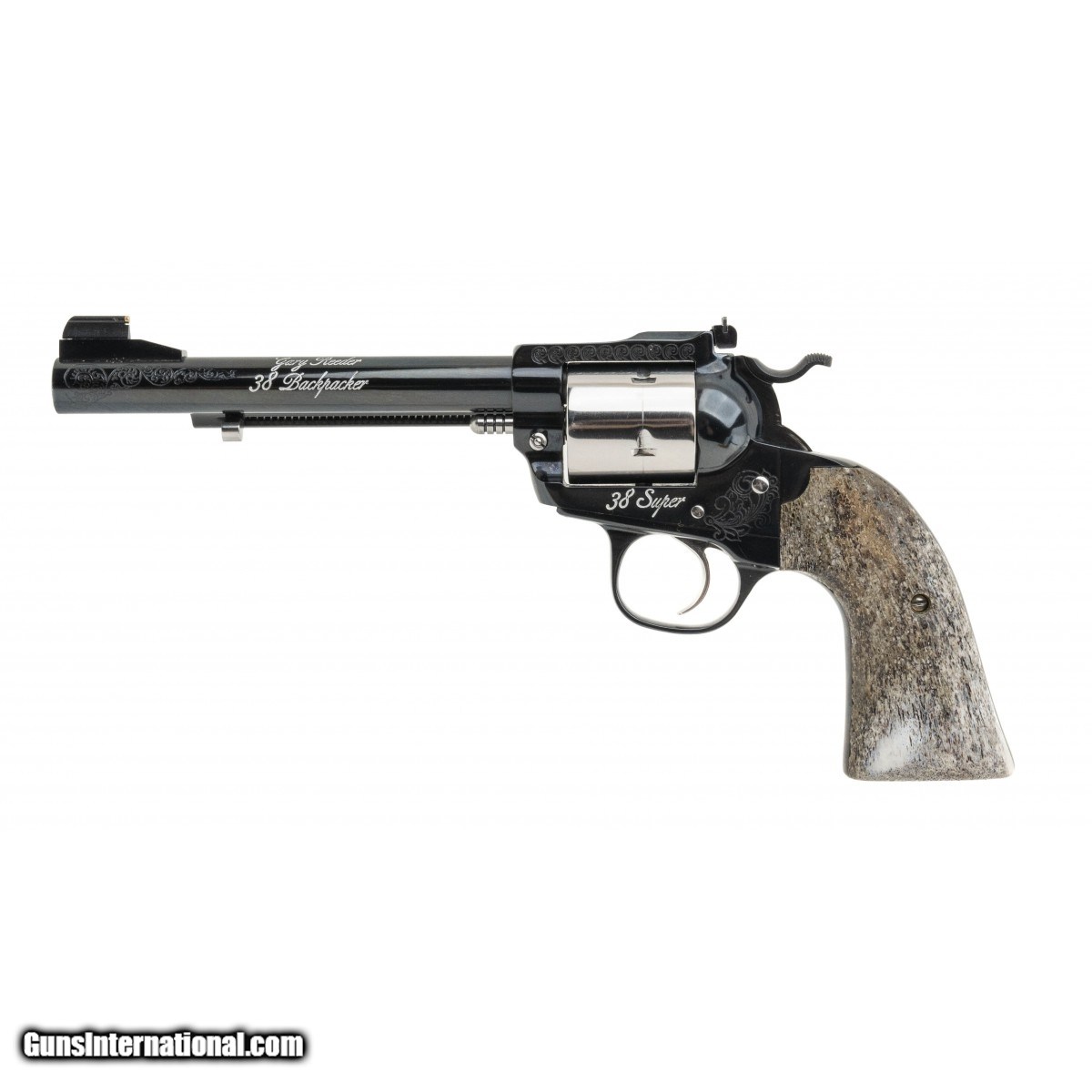 Description: " SN: 650-26054. Modern production .38 Super with a 6"" barrel. Highly customized ""Backpacker"" revolver by Gary Reeder in .38 Super. Features antler grips on an engraved midnight blue frame with an un-fluted stainless cylinder. Barrel is also engraved beneath the blade type front sight with gold bead insert. Excellent condition. SOLD |