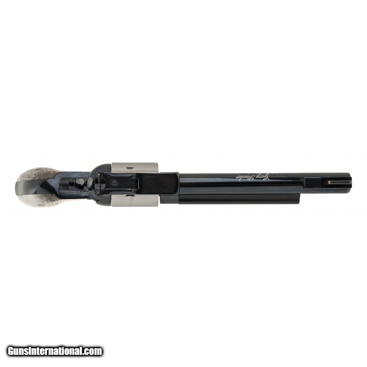 SN: 650-26054. Modern production .38 Super with a 6"" barrel. Highly customized ""Backpacker"" revolver by Gary Reeder in .38 Super. Features antler grips on an engraved midnight blue frame with an un-fluted stainless cylinder. Barrel is also engraved beneath the blade type front sight with gold bead insert. Excellent condition.