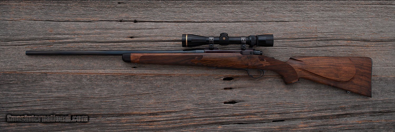 Description: Larry Kmoch - 77 - .22-250 caliber - Item Number: KMO73-23630 Rifle type: Bolt Action Action: Bolt Action Barrel length: 24 Sights: no sights Mounts: Scope: Leupold Power: 2-6x Weight: 8 lbs, 12 oz Overall condition: Very Good Stock condition: Very Good Metal condition: Very Good Stock: Original finish Metal: Original finish Type of Case: none Finish: Blue Type of Butt: Skeleton Buttplate Manufactured in: USA Lop: 13 5/8 " Hand: Right Comments : Beautiful rifle in very good condition. A few very light cabinet marks. R-91 SOLD |