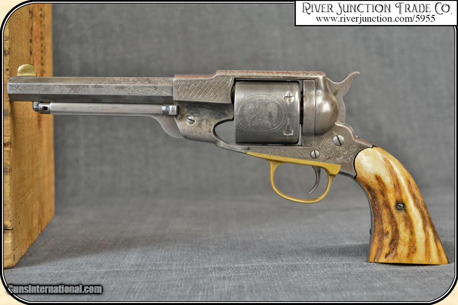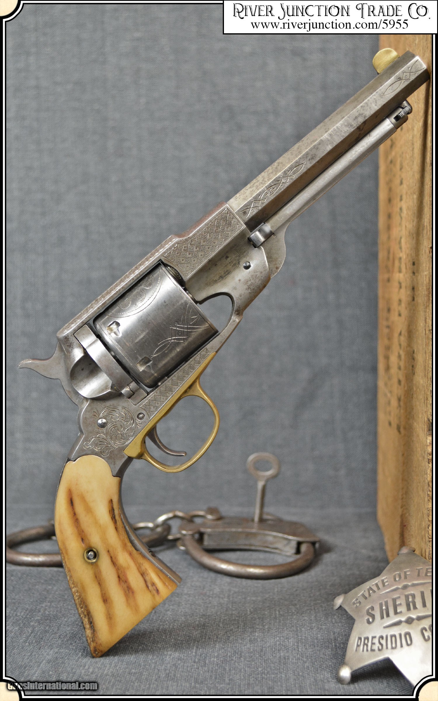Description: This is a 1858 Navy Model Remington reproduction converted to cartridge for me 40 years ago by the famous master miniature firearms maker Mike Barrett of Minnesota. This gun was originally a .36 caliber, but was re-chambered to .44 Russian caliber. I am pretty sure the recoil shield, cylinder and barrel were manufactured from stock steel. Later on I had the engraving added and still later found the bone grips and modified them to fit. A cute little feature is the hand held ejector rod hidden in the ball rammer. The mechanics are perfect. Locks up super tight. This revolver is fully functional. This is a extremely rare Barrett collectable. This is considered a modern firearm and must be shipped to a Federal Firearms License (FFL) Dealer. A copy of that license must be provided before shipment can be made. We always answer questions and entertain offers. Payment: Item, can be ordered with a credit card or paypal on our sight . Just Google (riverjunction) and type in the River Junction Trade Co. item number (5955) in the search box. Before you checkout you will see shipping cost and total. OR If you prefer: Pay by cash, postal money order, cashiers check, personal & business checks. We wait for checks to clear. Have questions? Call me 563-880-4588. Jim SOLD |