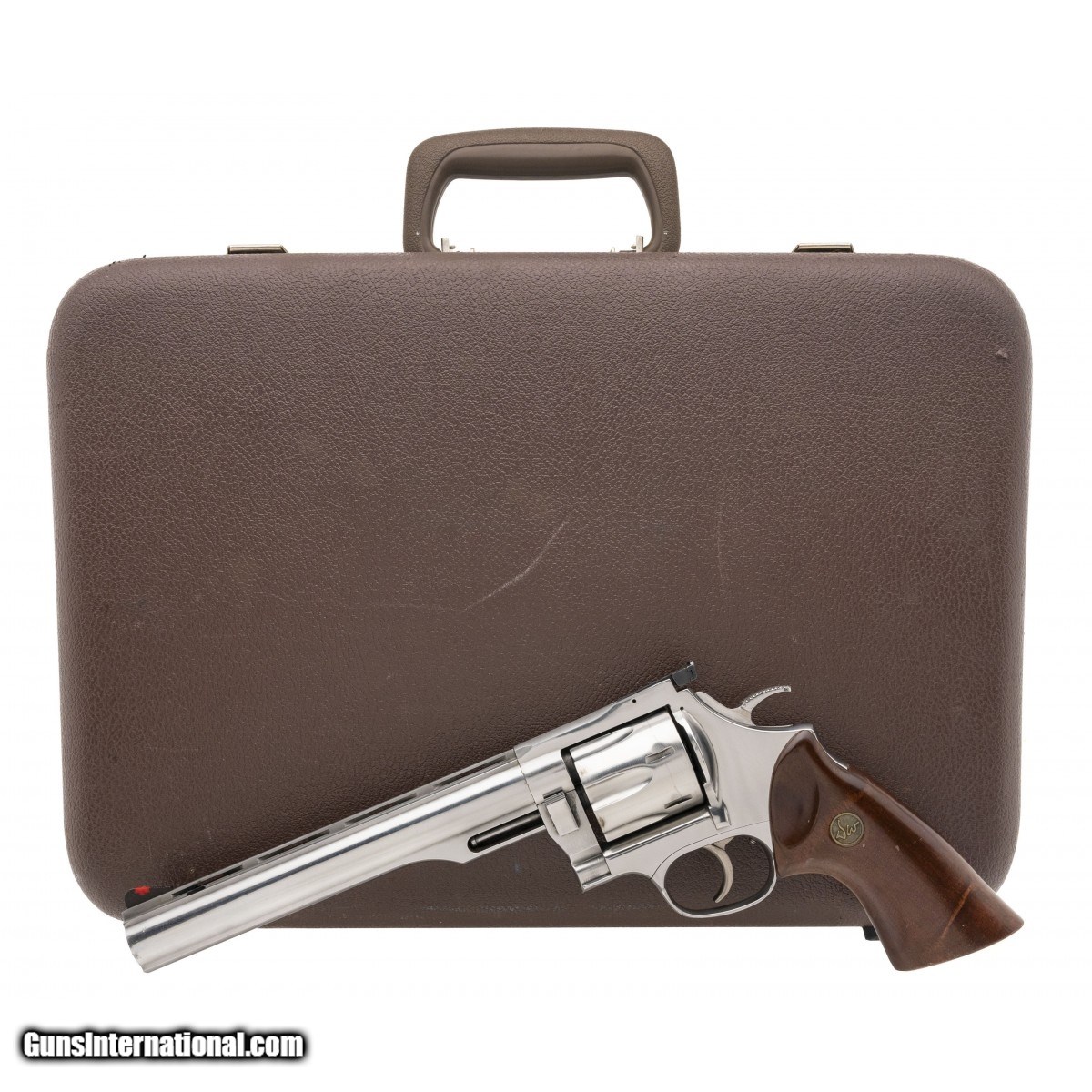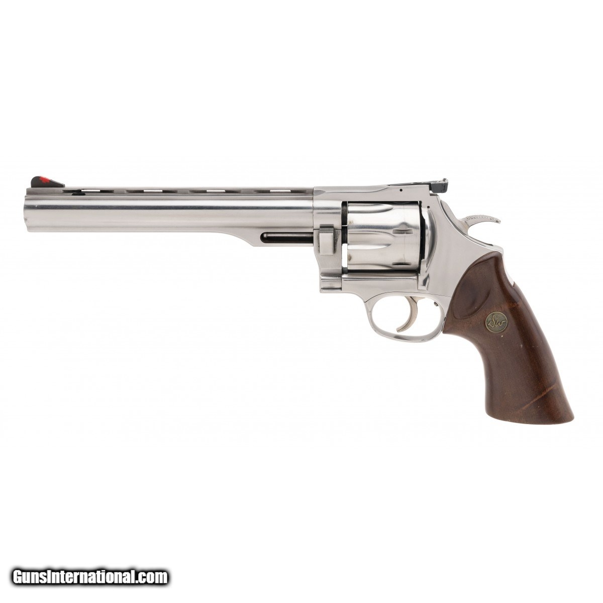 SN: 44S004898. 1980s vintage .44 Mag with 4"", 6"" and 8"" barrels. Scarce and desirable stainless big bore Pistol Pac. Has 4"", 6"" and 8"" vent rib barrels. The 6"" and 8"" shrouds have two barrels for each, ported and unported. The stainless has been polished and looks great. Comes with 2 sets of grips and various accessories all in the Dan Wesson case. Overall very good condition.