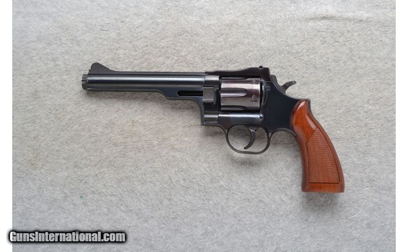 Description: This Dan Wesson Model 11 is a 6 shot double action revolver in .357 Magnum Cal. It has a 6 inch barrel. A raised front blade sight and a notch rear sight. It has a checkered walnut grip with a serrated back strap. It comes with a barrel changing wrench. The original box and a Safariland holster is included. .357 Magnum SOLD Chambers: 6 shot fluted cylinder. Metal Condition: Very good. Wood Condition: Very good. A few very minor handling marks. Bore Condition: Excellent. Barrels: 6 inch barrel. Triggers: Single Action. Double Action. Weight: 40 Oz. Sights: Raised blade front. Notch rear. Item Location: Richfield, WI |