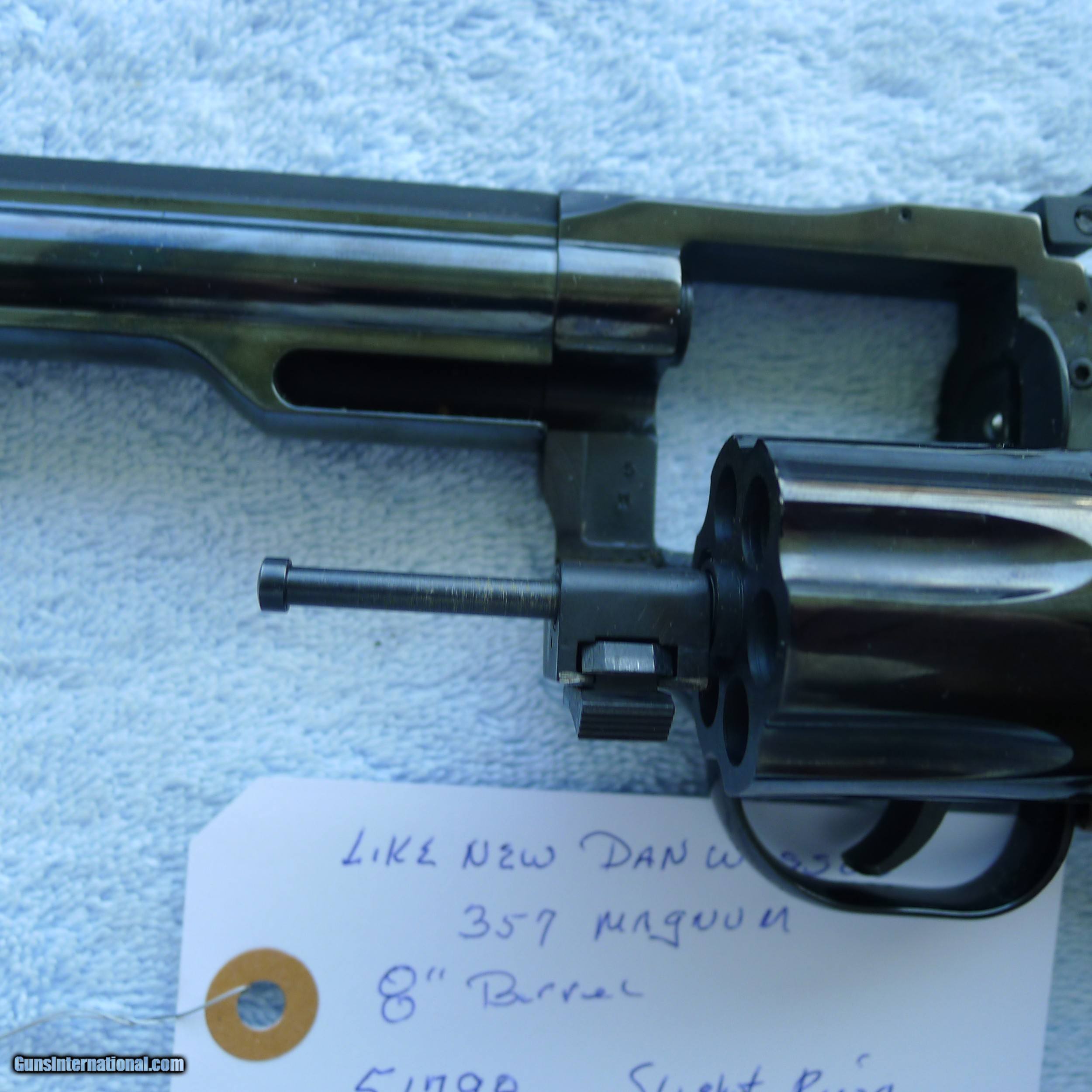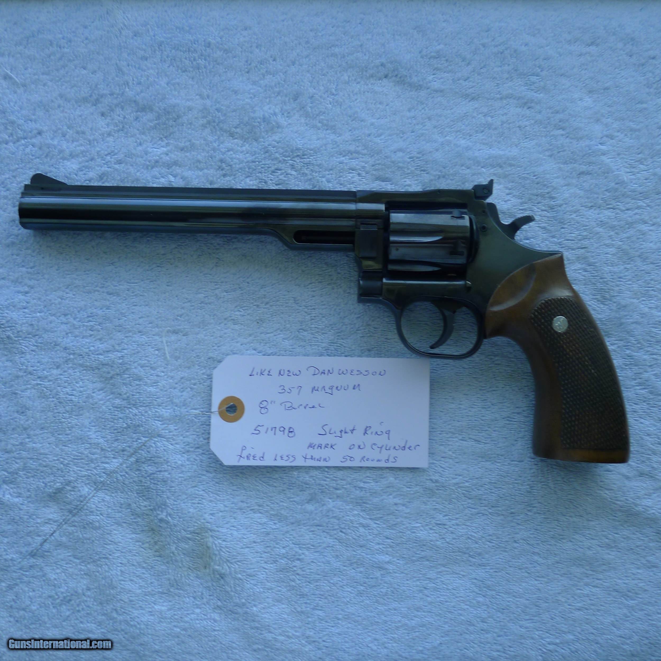 Description: This is a like new Dan Wesson 357 Magnum revolver with 8" barrel serial # 51798 with target sights and target grips. There is a slight ring around the cylinder done when setting the sights, This revolver was never in a holster but was kept in a bedside night stand . gun was fired less than 5 boxes. Buyer pays shipping and insurance. Will be shipped USPS Priority 3 day mail $35.00. Questions email only. additional info. THe takedown tool and shims ARE NOT WITH THE GUN. WHAT IS LISTED IS WHAT IS FOR SALE. PLEASE NOTE THERE IS NO DISCOLORATION ON THE FRAME. IT IS A REFLECTION OF THE FLASH AGAINST THE WD40 USED TO WIPE THE FINGER PRINTS OFF. WILL CONSIDER A LAYAWAY Sold pending receipt of funds SOLD |