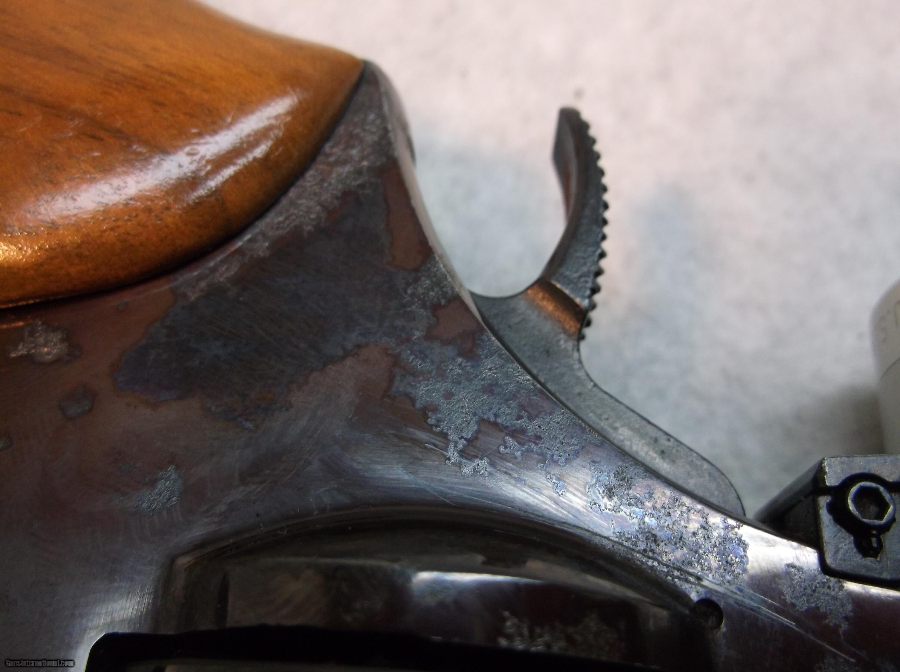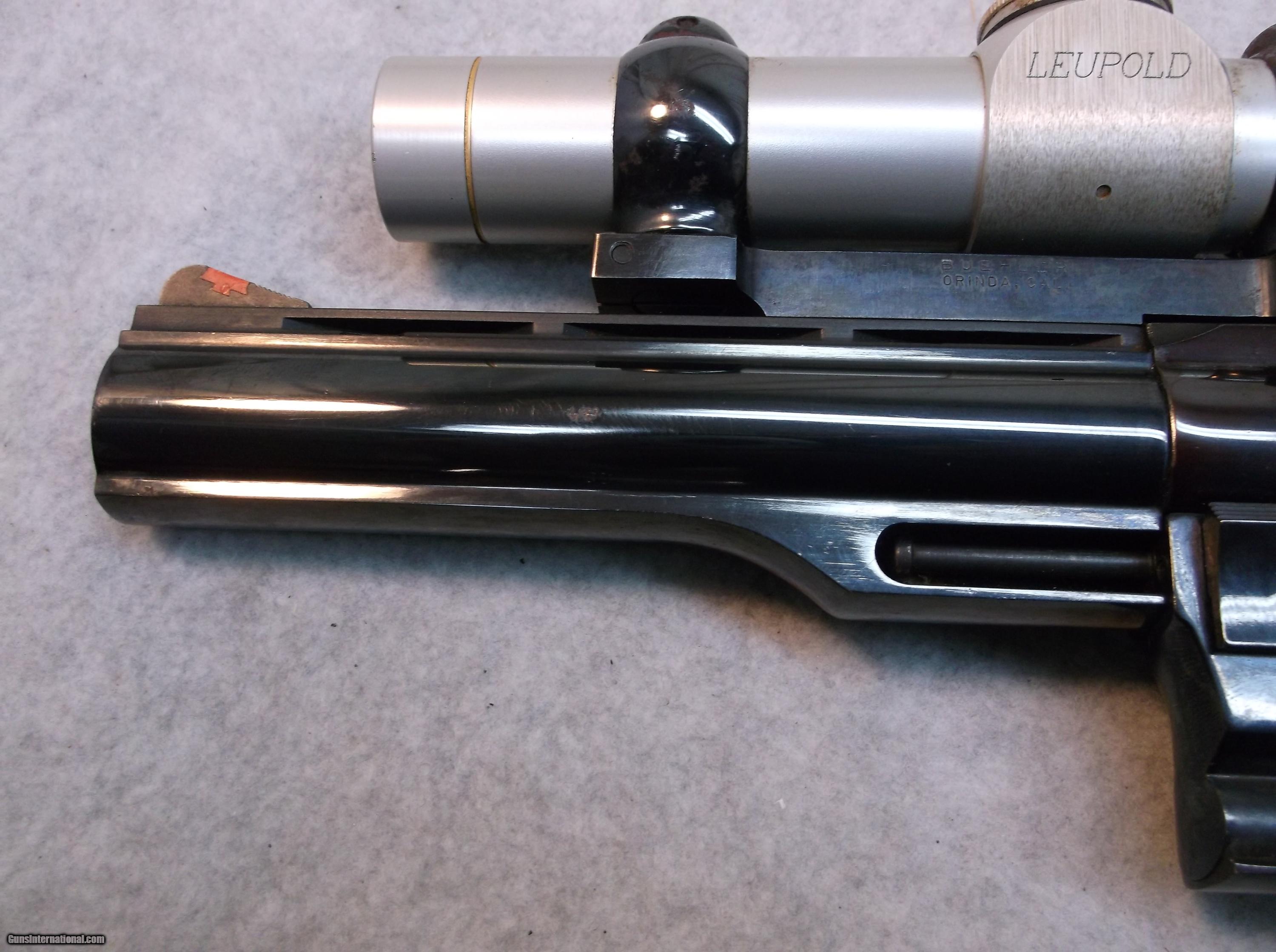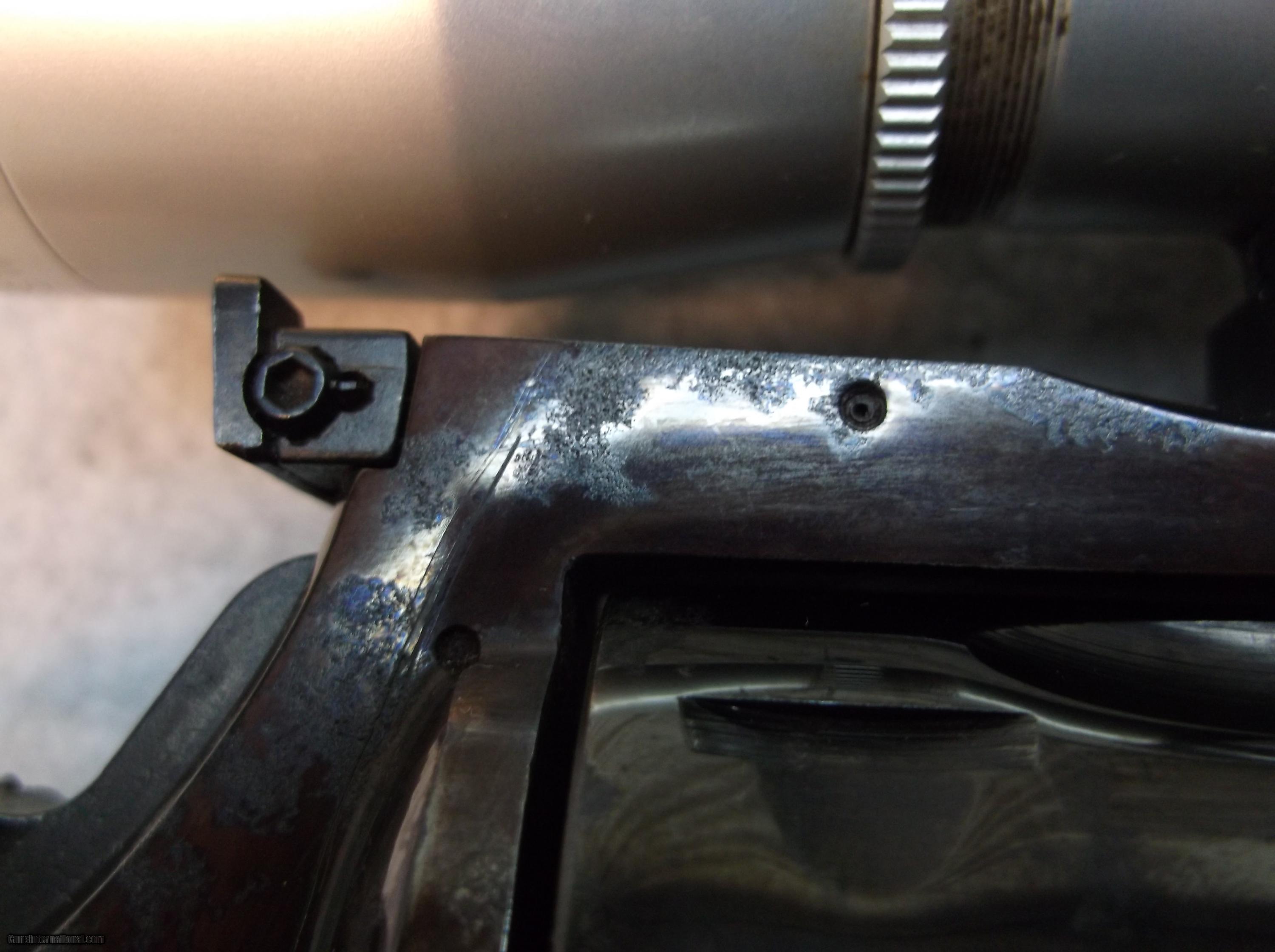 Description: Dan Wesson 44 Magnum revolver with 6" barrel and Leupold M8-2X scope. The bore is bright and shiny, lockup is tight. Grips are pretty much free of any cosmetic defects. The right side of the frame shows some pitting and discolorations, the left side is relatively clean. There are also a few minor pits on the barrel, inside the trigger guard, and on the cylinder. Scope rings have substantial rust. Stock number B-193, please use this number when referencing this item. Willing to ship anywhere in the USA to your FFL holder, buyer pays freight. SOLD Manufacturer: Dan Wesson Model: 6" Revolver Serial Number: B01XXX9 Caliber Info: 44 Mag Item Location: Eugene, Oregon |