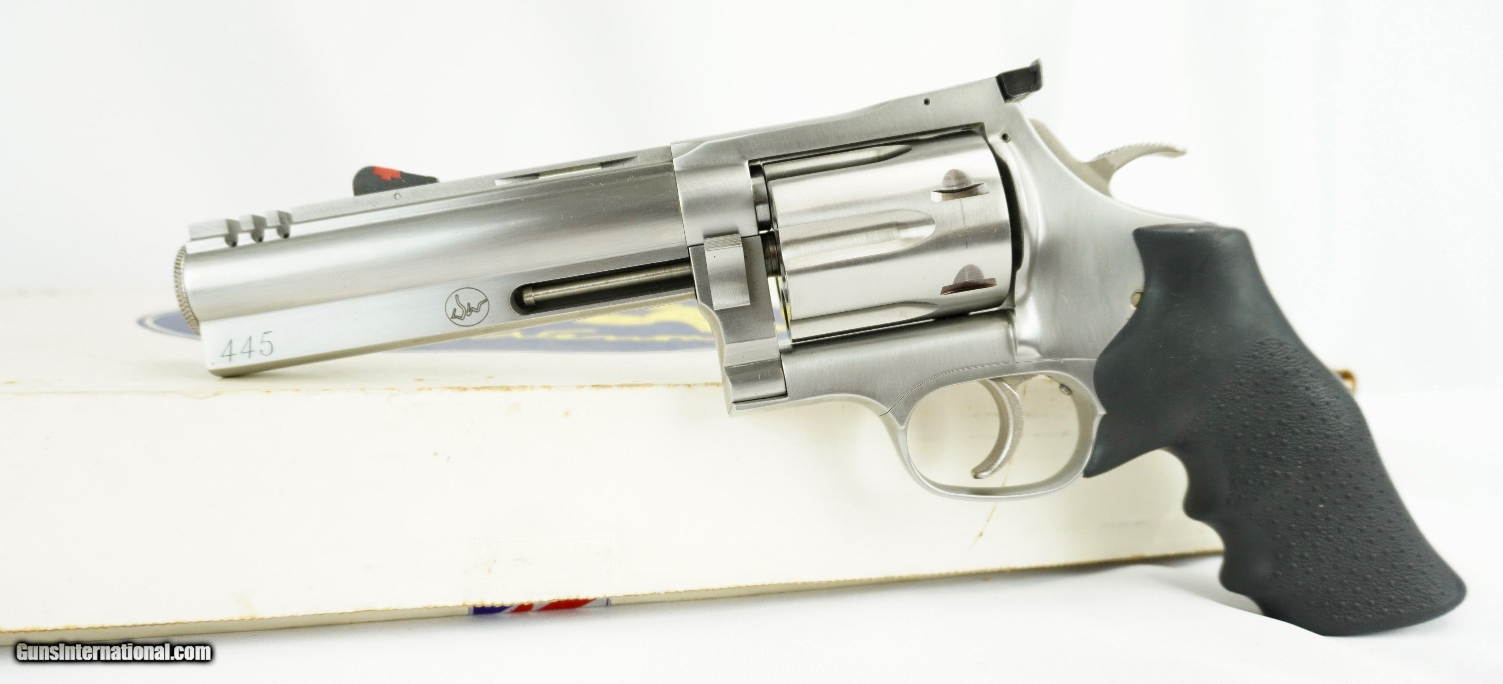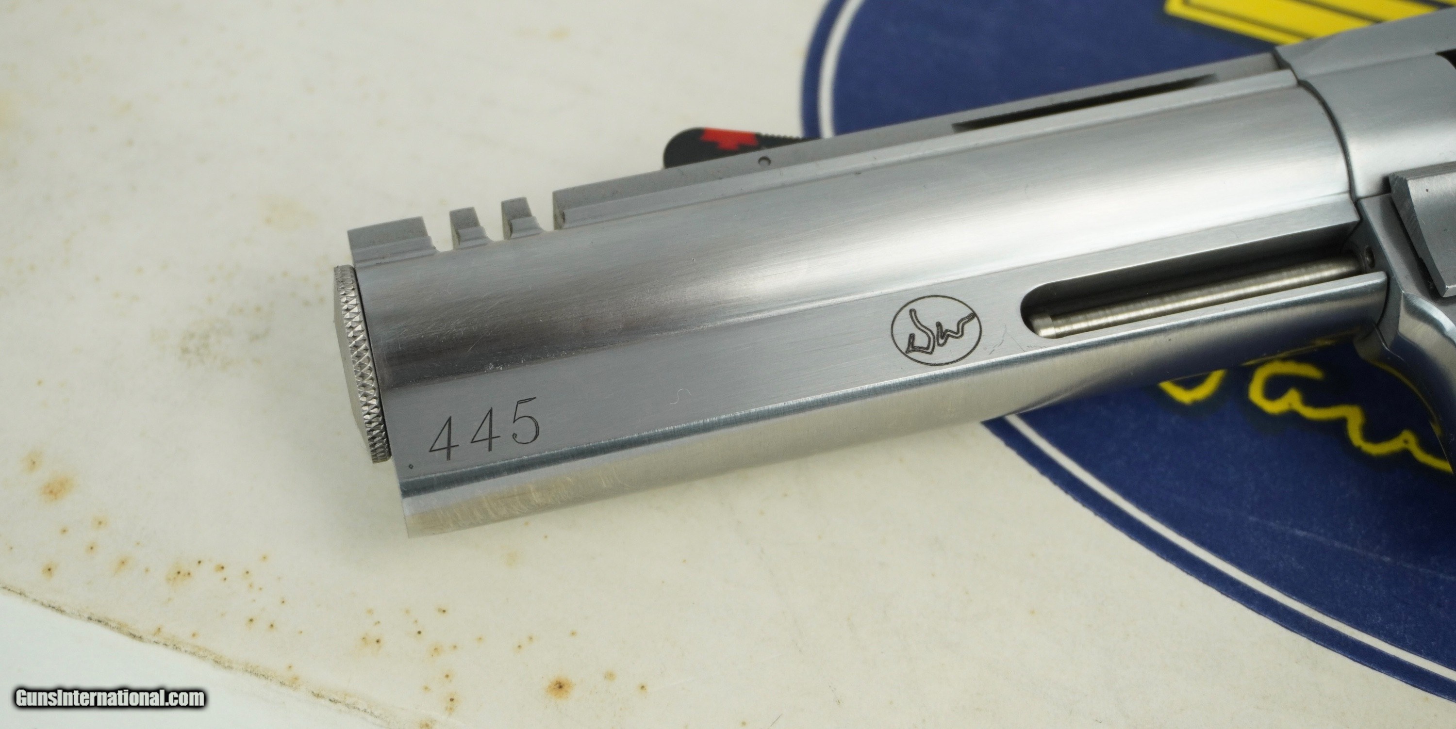Description: Dan Wesson 7445 VH4C .445 SuperMag 4" Vent Heavy Compensated Early production #36.with holster. Excellent condition We have some brass and ammo, which will ship separately. SOLD Handgun Caliber: .445 SuperMag (.4295 RIC) Manufacturer: Dan Wesson Model: 7445 VH4C Barrel Length: 4 Metal Condition: Excellent Bore Condition: Excellent Action: Revolver Finish: Stainless Steel Weight: 3 lbs 8 oz Extras: Holster, Ammo and Brass |