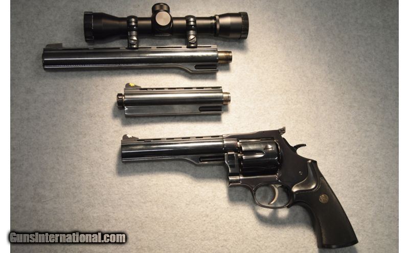 Description: Dan Wesson Model 44 Revolver. Chambered in .44 Magnum with a six round capacity. Comes with a whole collection of accessories and tools, including three different sets of additional grips, and two extra barrels. Double action with Extremely light trigger pull. It comes in a Plano XL pistol case that fits all the extra parts and accessories. The revolver is in over all very good condition with only a few signs of usage and wear. .44 Magnum SOLD Metal Condition: Good overall condition aside from minor pitting on top strap and the marks on right side of frame in front of the cylinder Wood Condition: Minor wear on wood grip sets Bore Condition: Very good Barrels: 6"" barrel, 6"" threaded barrel, 10"" barrel with optic mounted Triggers: Dan Wesson Factory Trigger Weight: 4 lb. 9 oz. Sights: Simmons 4x32 Prohunter, Adjustable Rear Sight, Front Sights With Dovetailed Inserts Item Location: Avon, OH |