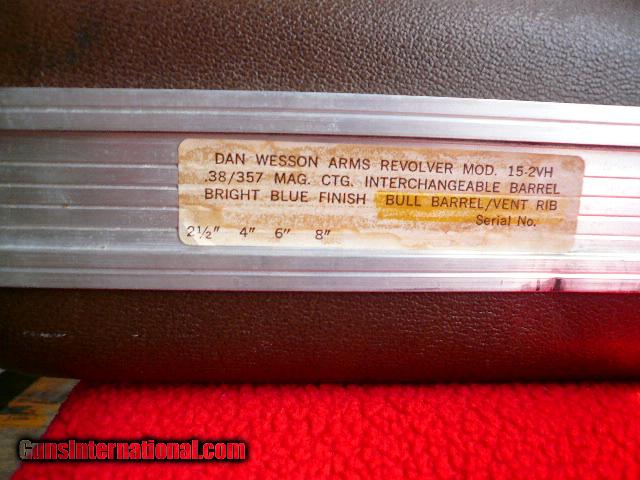 Description: DAN WESSON ARMS REVOLVER. MODEL 15-2VH PISTOL PACK 38 / 357 MAGNUM. INTRCHANGEABLE BULL BARRELS 2.5", 4", 6", 8" WITH VENT RIB. BRIGHT BLUE FINISH. GOOD CONDITION. 1375 SHIPPED TO YOUR FFL EMAIL OR CALL 440-341-0432 WITH QUESTIONS. SOLD |