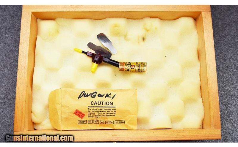Description: This Dan Wesson is in very good overall condition. There are some light scratches and wear on barrel as well as cylinder ring. Some light blue loss from holster wear. Comes with homemade padded wooden box and barrel changing tool! Very nice. .357 Magnum SOLD Metal Condition: Very Good Wood Condition: Very Good Bore Condition: Excellent Barrels: 6" - Solid Rib Triggers: Wide Target Trigger and Hammer Fore End: Checkered Walnut with Dan Wesson Medallion Butt Pad: Checkered Walnut with Dan Wesson Medallion Weight: 40 Oz. Sights: Ramp Front With Red Insert - Adjustable White Outline Square Notch Rear Item Location: Tulalip, WA |