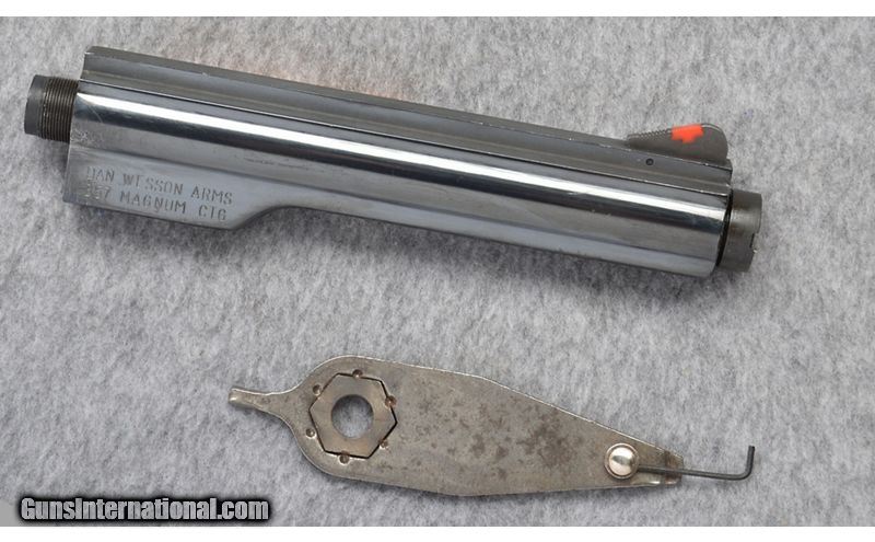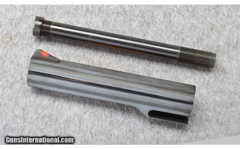 Description: Very high condition revolver shows few scattered light scratches, some pitting on the extra barrel. Equipped with 8 inch heavy shroud barrel and walnut target grips. No Box. .357 Magnum SOLD Metal Condition: Polished Blue Wood Condition: Couple nicks and scratches Bore Condition: "Bright, Sharp Barrels: 8 Inch Triggers: DA/SA Weight: 50 Oz. Sights: "Adjustable Rear Sight, Red Ramped Front Item Location: Buda, TX |