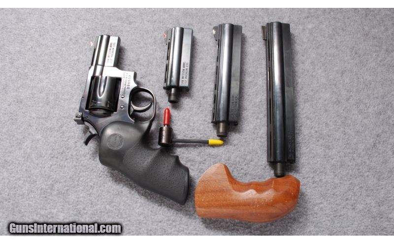 Description: SOLD Caliber Info: .357 Magnum Metal Condition: Minor scratches and handling marks Bore Condition: Strong rifling in all barrels Barrels: Four vented bbls.: 2", 3.5", 5.5", 7.5". Triggers: DA/SA Stock: Wood grips and Hogue Monogrips. Weight: 2 Lbs. 5 Oz. Sights: Adjustable notched rear sight. Ramped front blades. Extras: 4 barrels, wood grips, wrench Item Location: Billings, MT |
