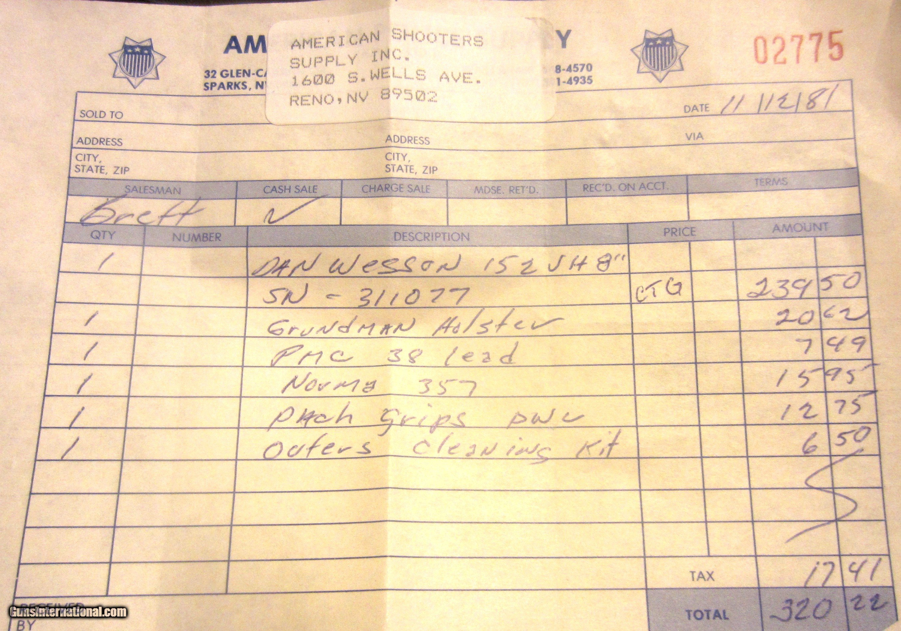 Description: THIS ONE IS IN REALLY GOOD CONDITION~DAN WESSON 15-2 MONSON WITH 8 INCH VENT HEAVY BARREL~INCLUDED IS BARREL NUT TOOL, A NEW HOGUE HARDWOOD GRIP & PAPERWORK AND THE ORIGINAL RECEIPT FROM THE PURCHASE IN 1981 IN RENO NEVADA (SEE PIC) ALL IN ORIGINAL BOX WITH MATCHING SERIAL NUMBER! IF YOUR LOOKING FOR ONE THAT'S IN REALLY GOOD CONDITION, THIS IS IT! THE FINISH IS STILL BEAUTIFUL DARK BLUE (NO PURPLE OR PLUM FRAME) AND NO SCRATCHES BEHIND CYLINDER! YOU CAN TELL VERY FEW ROUNDS HAVE BEEN THRU IT BY LOOKING AT CYLINDER AND SLAM PLATE! YOU CAN ALSO STILL BUY EXTRA BARRELS ON CZ-USA THEY HAVE 2, 4, & 6 INCH BARRELS FOR SALE BRAND NEW AT GREAT PRICES! DAN WESSONS ARE KNOWN FOR BEING THE MOST ACCURATE GUNS MADE & YOU CAN CHANGE BARRELS IN MINUTES! THIS IS A NO TAX PRIVATE SALE PAYMENT WILL BE PERSONAL CHECK, BANK CHECK OR USPS MONEY ORDER! WILL SHIP FROM MY FFL TO YOURS AND INCLUDED FREE INSURED SHIPPING! DON"T WAST YOUR TIME ON A JUNK LOW CONDITION GUN SPEND A BIT MORE AND GET ONE IN EXCELLENT CONDITION! I'M A TRUSTED SELLER ON GI WITH OVER 40 SALES OVER THE LAST 5 YEARS! Handgun Caliber: .357 Magnum Manufacturer: Dan Wesson Model: 15-2 Barrel Length: 8 VH Bore Info: LIKE NEW Chambers: 6 Condition: Excellent Metal Condition: Excellent Bore Condition: Excellent Barrels: 1 Barrel Type: Interchangeable Vent Action: Single/double Finish: Deep Blue Sights: ADJUSTIBLE Manufacture Date: 1981 Engraving: No Extras: Yes Case: Yes Item Location: AZ Price: $849.00 Contact Seller |