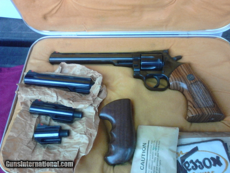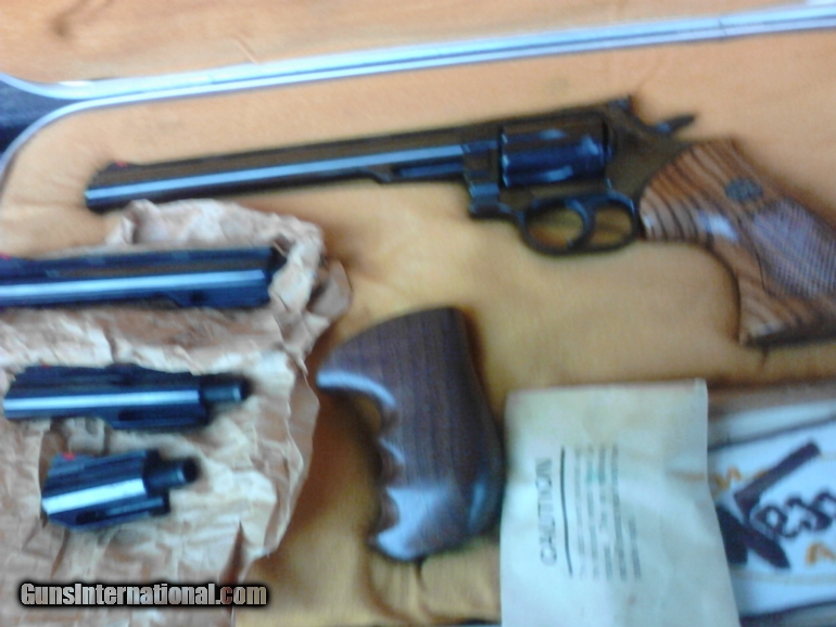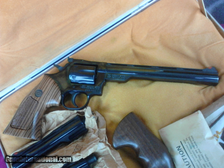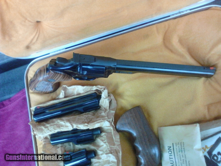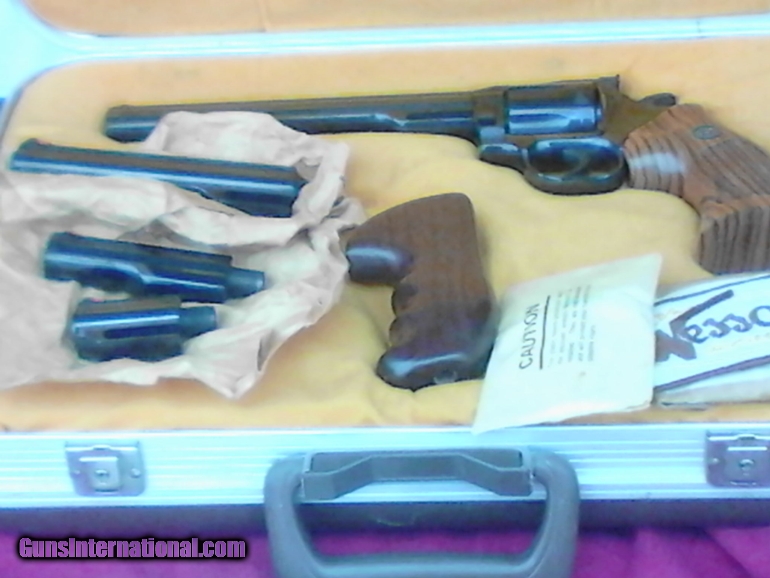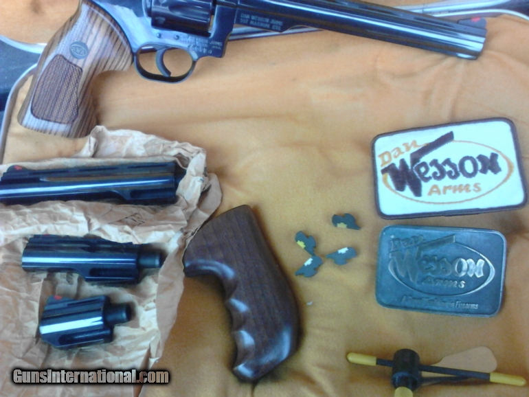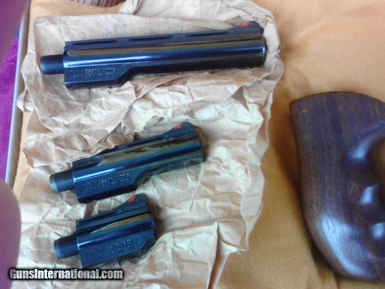Description: Dan Wesson pistol pac with 4 barrels 2-4-6-8 in all in like new condition. Has belt buckel-sights-tool and gauge. Gun and grips are like new in original case. Very light turn ring. Looks almost unfired SOLD |